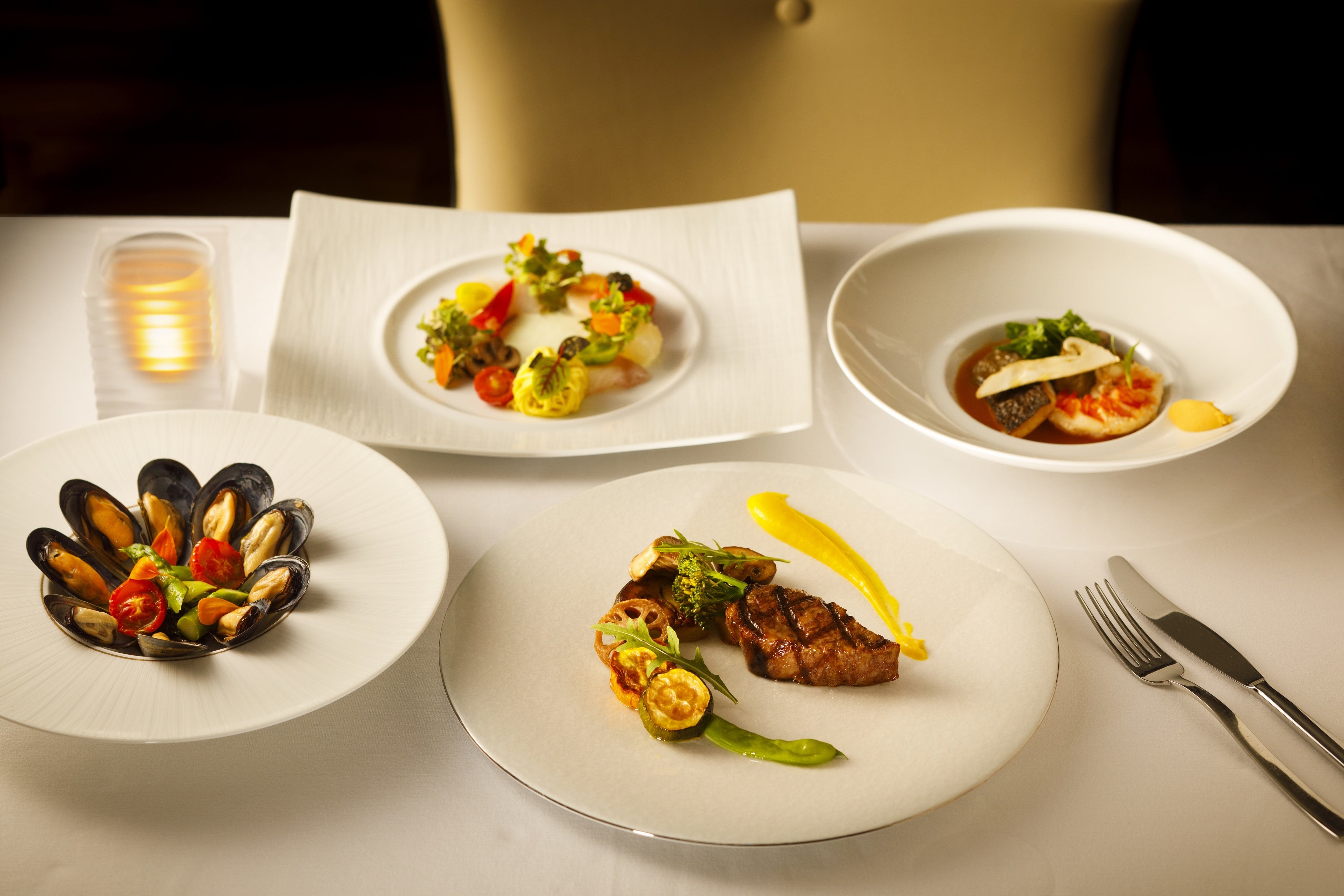 料理長 田坂嘉隆がセレクトした秋の食材をふんだんに味わっていただけるコースメニュー。注目はフランスのモン・サン・ミッシェルから生きたまま届けられる新鮮なムール貝を、バターを加えた白ワインで蒸したマリニエール。この時期にしか味わえないとろけるような柔らかな身と甘みのある豊かな味わいをお楽しみください。シグネチャーの「モンブラン」は蟹のレムラードをカボチャのピューレで包むなど、その日一番おいしい秋の食材で仕上げます。メインディッシュには甘くてコクのある脂が特徴の佐賀牛のサーロインもお選びいただけ、秋の夜をご満喫いただけるお料理の数々が揃っています。