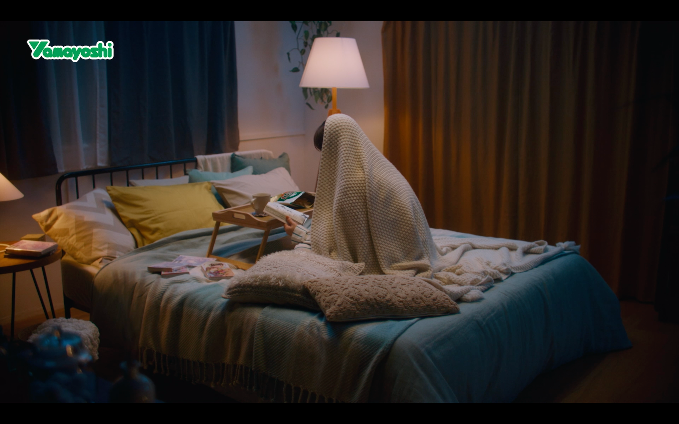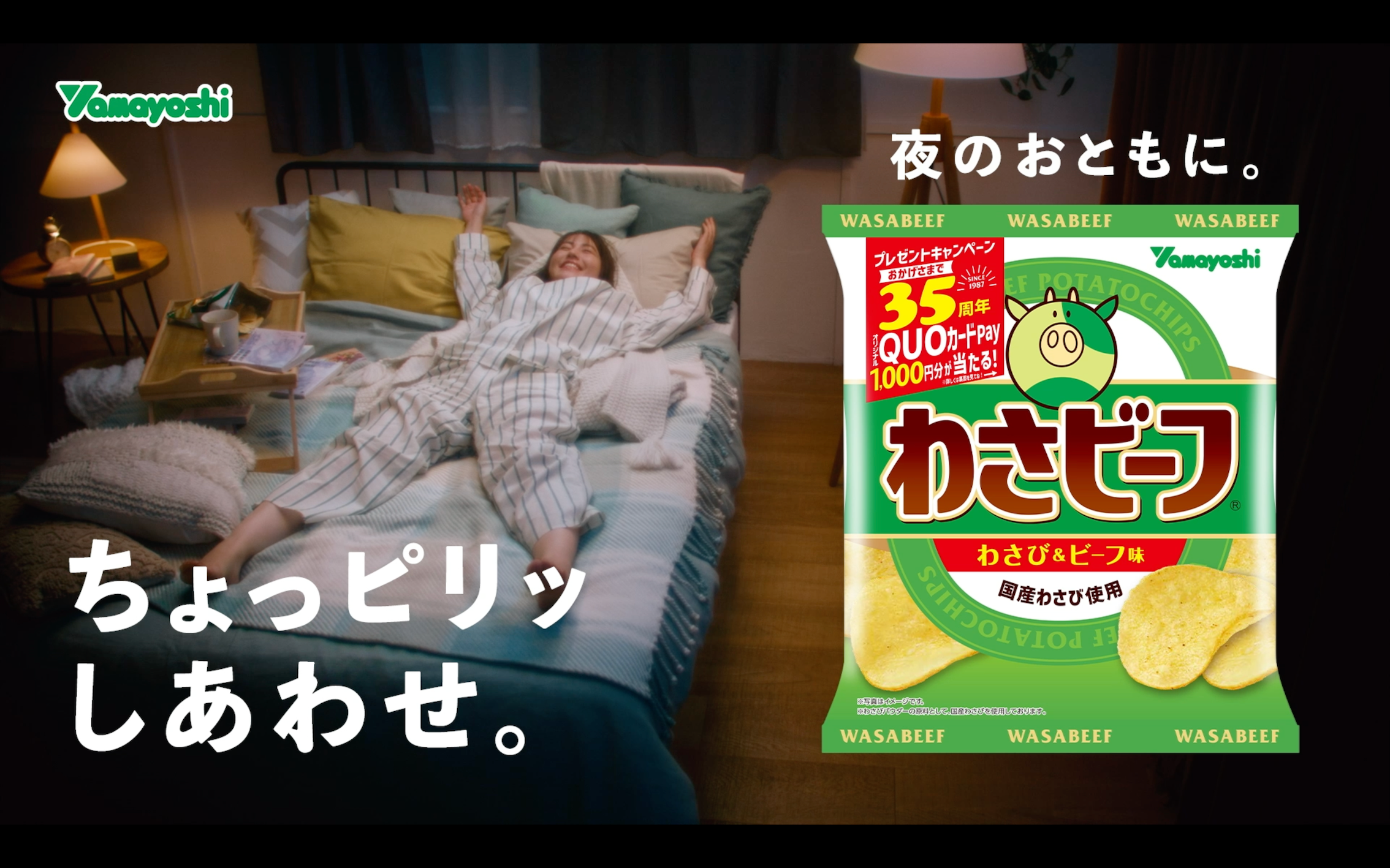35周年を迎えるわさビーフのテーマは「夜のおともに。わさビーフ」。パジャマ姿の磯山さやかさんが就寝前のリラックスタイムにわさビーフとともに涙活を楽しむ様子を描いた「涙のリビング編」「涙のベッドルーム編」の2篇を公開します。
