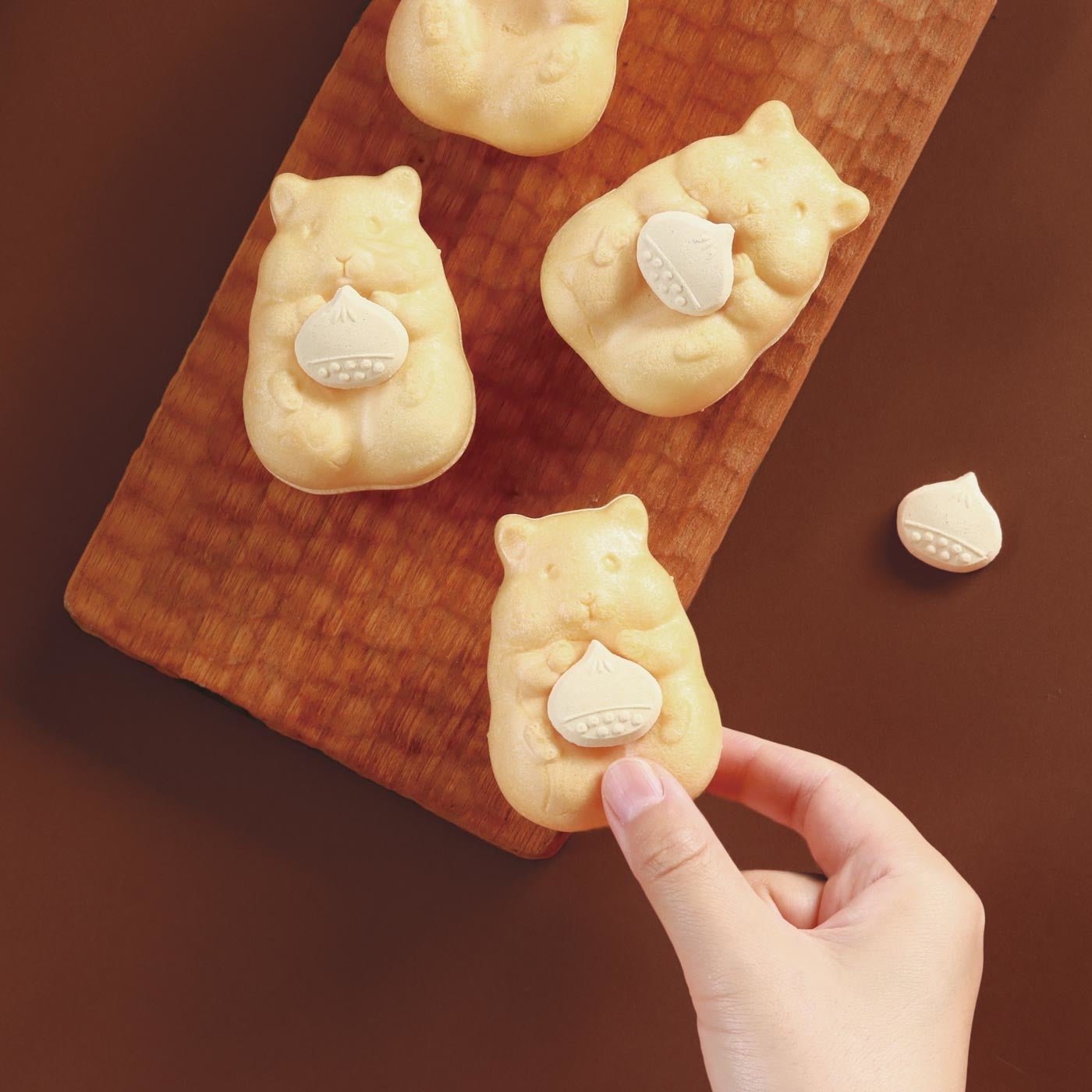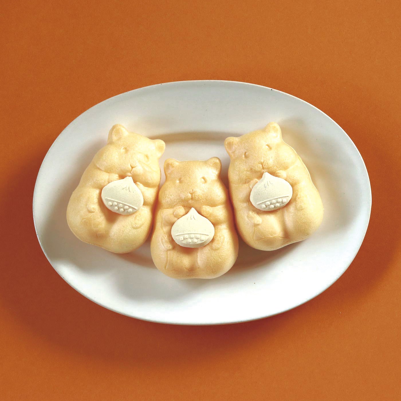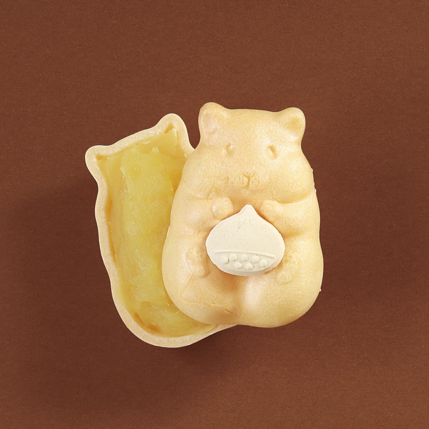 秋限定バージョンのハムスターに持たせるものは、栗の形のらくがんです。ハムスターのおなか部分が少しくぼんでいるので、付属の栗のらくがんを一粒置いてお召し上がりいただけます。