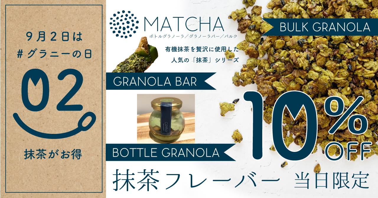 抹茶を使用したグラノーラ、スイーツが10%OFFになります。グラニーでは材料にこだわり有機抹茶を使用しています。国産有機抹茶ならではの品のある香りをお楽しみいただけます。