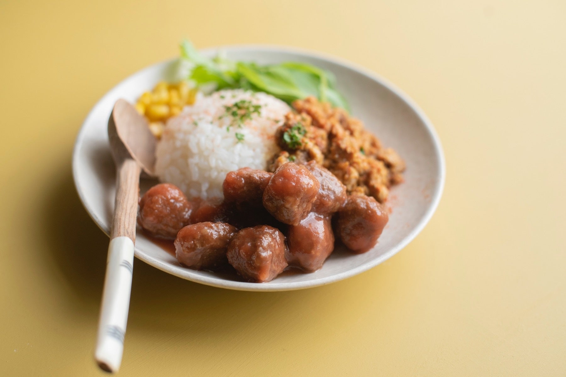 20周年を迎えたカレーミートボールは、この4種類の中で3番目に誕生しています。おこさまの好きな味はなんだろうと、トマト、照焼の次に声としてあがったのがカレー味でした。開発スタートから半年ほどで、発売を開始しています。ソースも最後まで残さないで食べてもらいたいという思いを込め、ソースのコクを出すための開発には工夫を重ねてまいりました。卵・乳成分は使用はせず、たっぷりとした野菜ピューレでうまみを出しその野菜がとけこんだマイルドなカレー味のソースです。冷めてもおいしくやわらかく、パンにはさんだり、ごはんにかけたりと色々と楽しめる一品です。(メーカー希望小売価格:120円(税込129円)/袋)