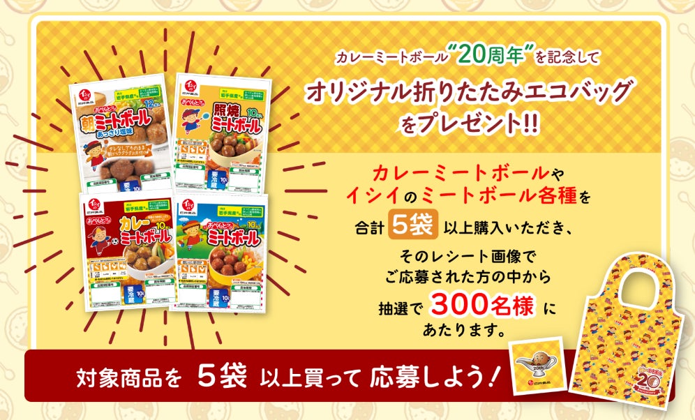 カレーミートボールをはじめとする、「イシイのおべんとクン ミートボールシリーズ」を合計5袋以上(5袋で1口として応募可能)ご購入いただき、購入された際のレシート画像を使用しご応募いただくと、抽選で300名さまに、カレーミートボール20周年を記念した「オリジナル折りたたみエコバッグ」をプレゼントいたします。