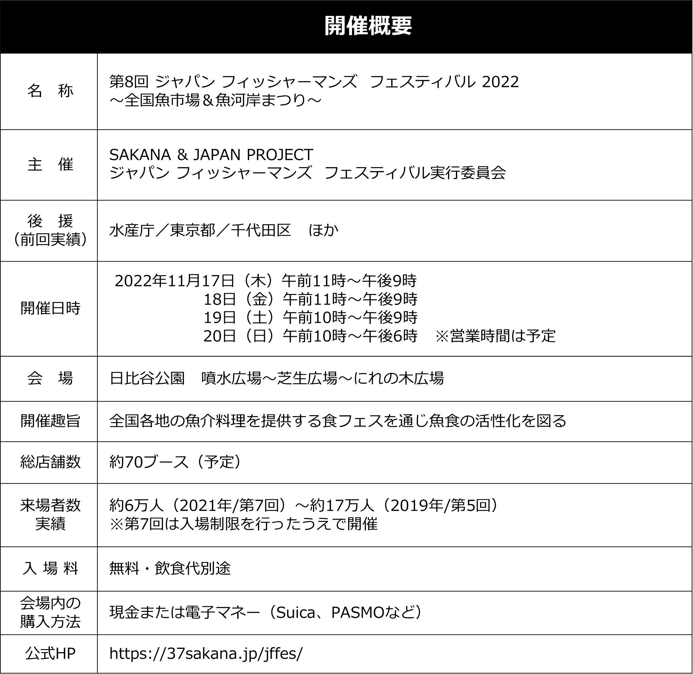 全国各地の魚介料理が堪能できる日本最大級の魚食イベント「第8回 ジャパン フィッシャーマンズ フェスティバル2022~全国魚市場&魚河岸まつり~」(主催・SAKANA & JAPAN PROJECT ジャパン フィッシャーマンズ フェスティバル実行委員会)が、2022年11月17日(木)~20日(日)の4日間、日比谷公園(東京都千代田区)で開催されます。