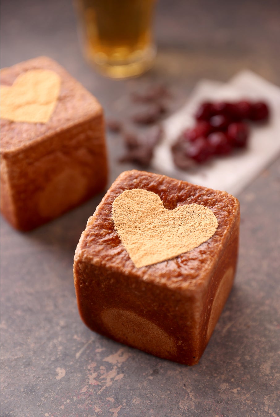 ちいさな四角い形にハート形の模様が特徴の“プチキャレ”。季節ごとに様々な味わいをご用意している人気パンシリーズで、今秋には期間限定の味わいが楽しめる新作が登場。中のガナッシュ(チョコレートクリーム)にアルマニャック(ブランデー)で香りづけし、フランス産チェリー「グリオット」を閉じ込めています。