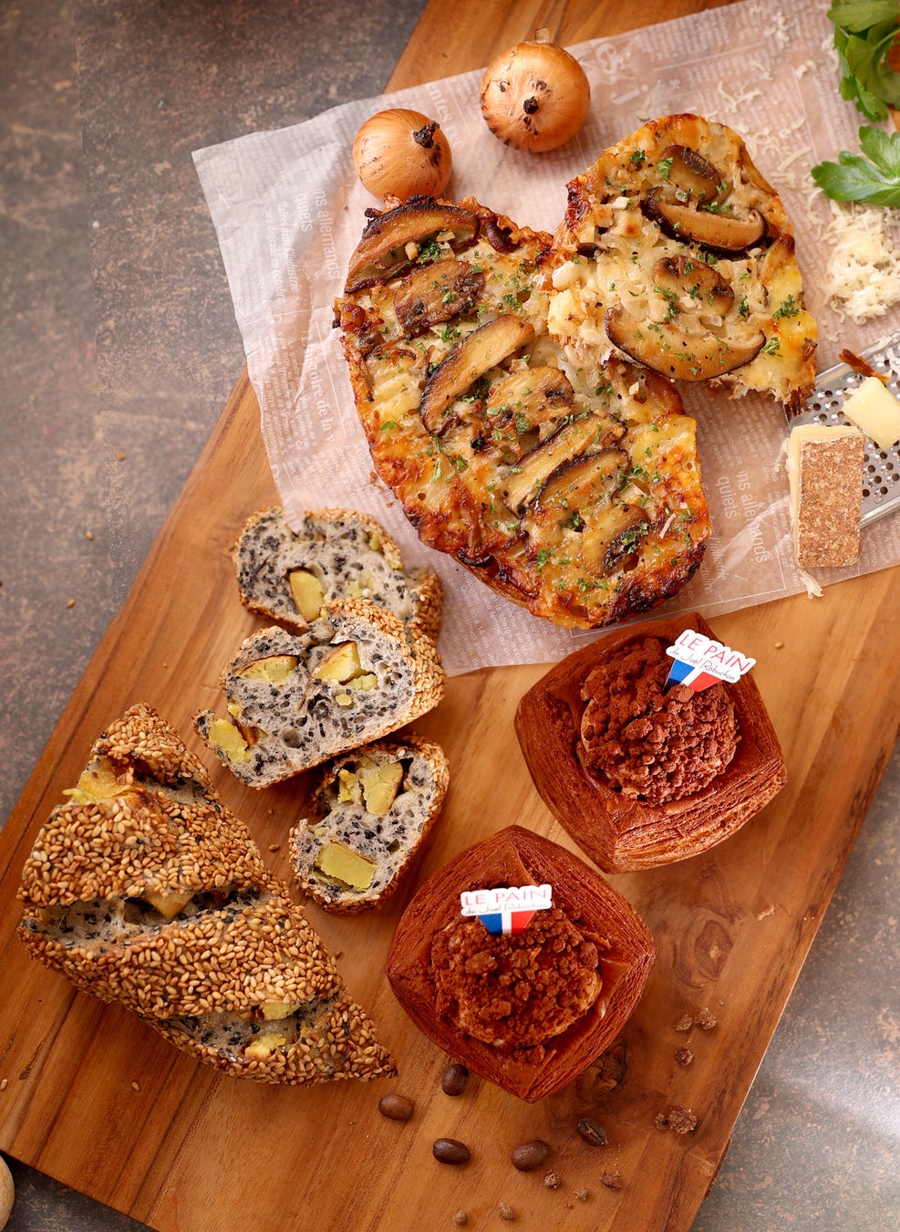 サクサク食感のクロワッサン生地に、 野菜を重ねて焼き上げるフイユテ~パイ仕立て。産地直送の4種類のキノコ(茨城県産シイタケ、マッシュルーム、しめじ、宮崎県産エリンギ)と玉ねぎをガーリックオイルとチーズを重ねて焼き上げた秋限定の新作です。