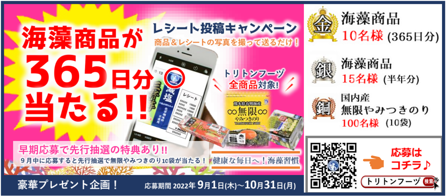海藻の総合メーカーである株式会社トリトンフーヅ(本社:熊本県宇土市城塚町169-1、代表取締役社⻑:髙⽊ 良樹)は、今年春に実施し大好評をいただいた『パシャッと応募!「商品+レシート」写真投稿キャンペーン』について、第2回を9月1日より開催します。本キャンペーンでは、商品を店頭で購入し、レシートと一緒に撮影・投稿いただいた方より、抽選でトリトンフーヅの豪華商品をプレゼントいたします。