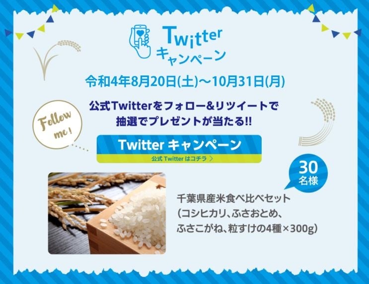 また、公式Twitterをフォロー&リツイートいただいたお客様に、抽選で30名様に千葉県産米食べ比べセットをプレゼントする企画も併開催します。