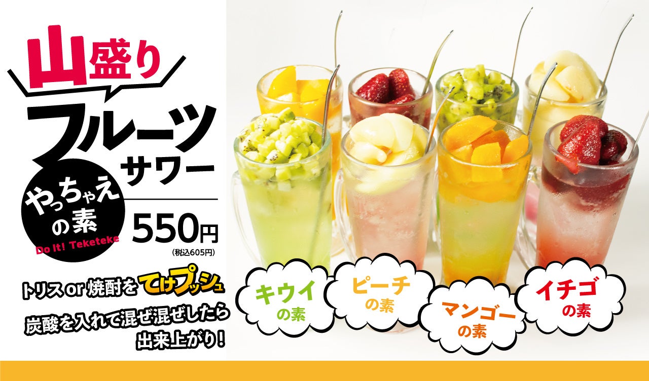 “てけプッシュ”をより一層楽しんでいただくために、『やっちゃえ!てけてけ』業態オリジナルメニューの“やっちゃえ!の素”をご用意。冷凍フルーツをグラスいっぱいに詰め込んだフルーツサワーをお楽しみいただけます。卓上のウイスキーを使ったフルーツハイボール、卓上シロップを追加してお好みのオリジナルドリンクにするなど、“てけプッシュ”を最大限楽しむためのオリジナルメニューです!