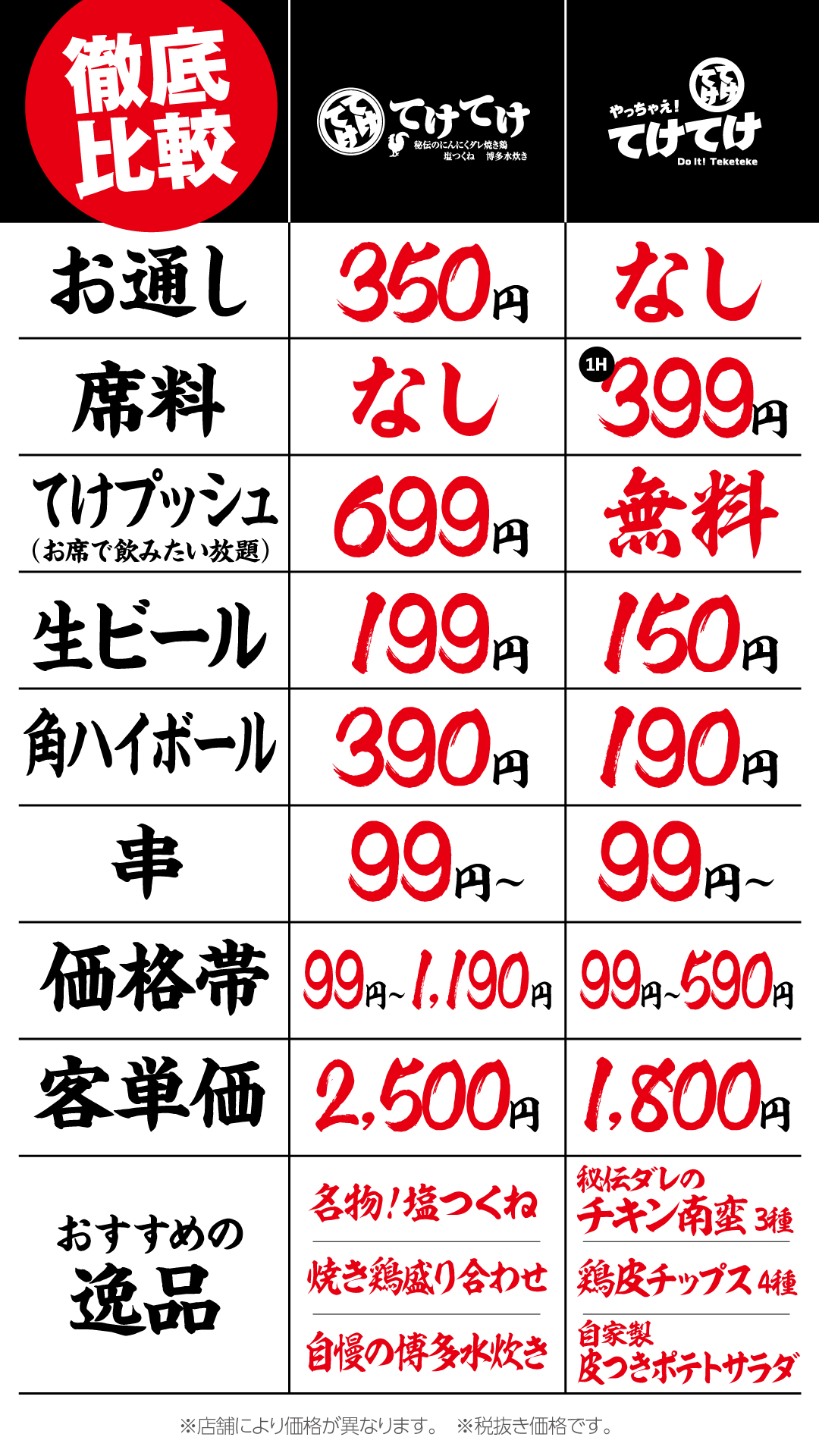お食事をメインに宴会やコースをご利用の際は「てけてけ」へ、お酒をメインに気軽に楽しみたい時は『やっちゃえ!てけてけ』へ、その日の気分やシーンに合わせてご利用いただければ幸いです。