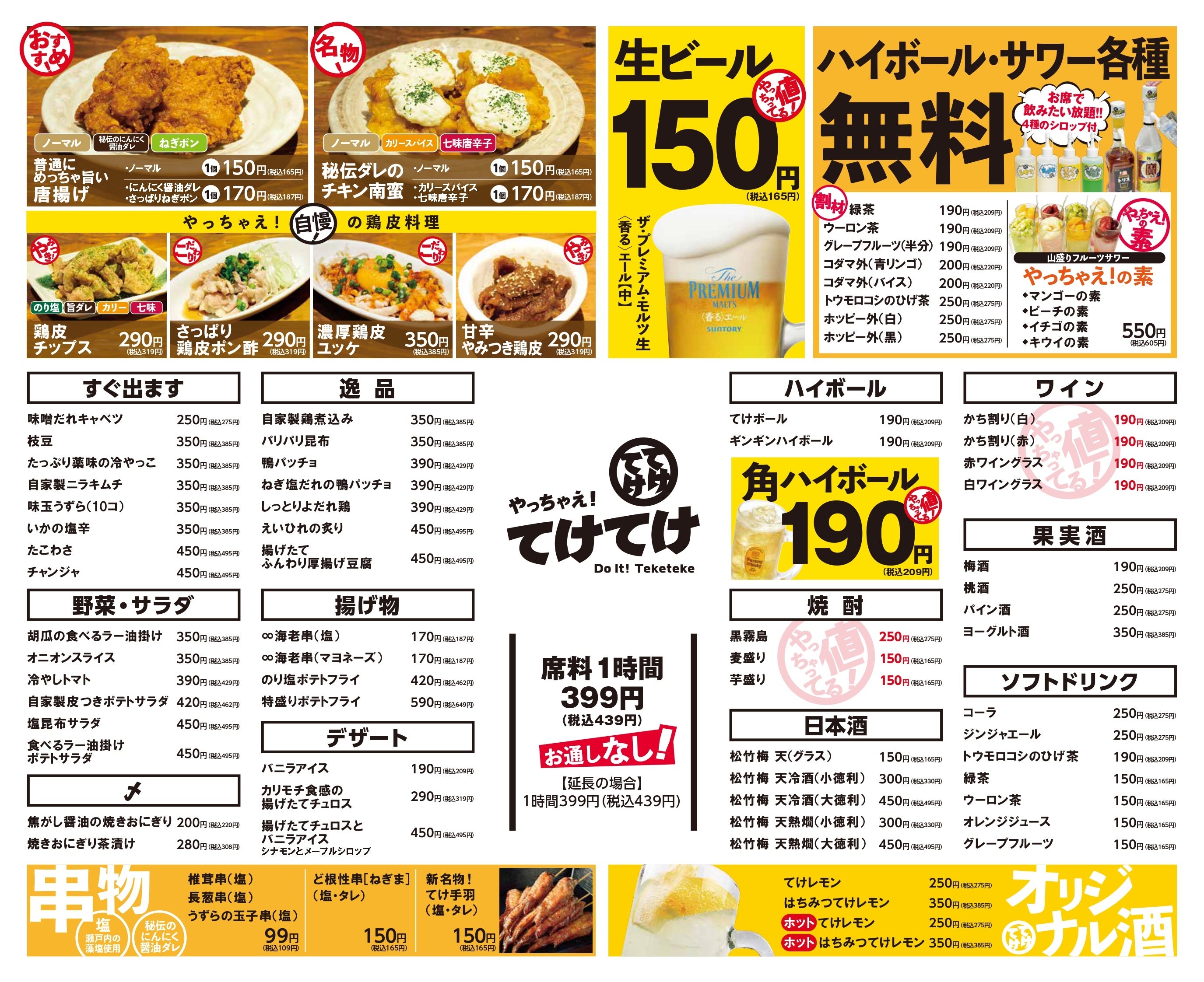 9月6日(火)~9月12日(月)の1週間、オープン記念キャンペーンとして、ドリンク全品を99円(税抜)にて販売します!この期間だけの特別価格で、『やっちゃえ!てけてけ』を是非お楽しみください。