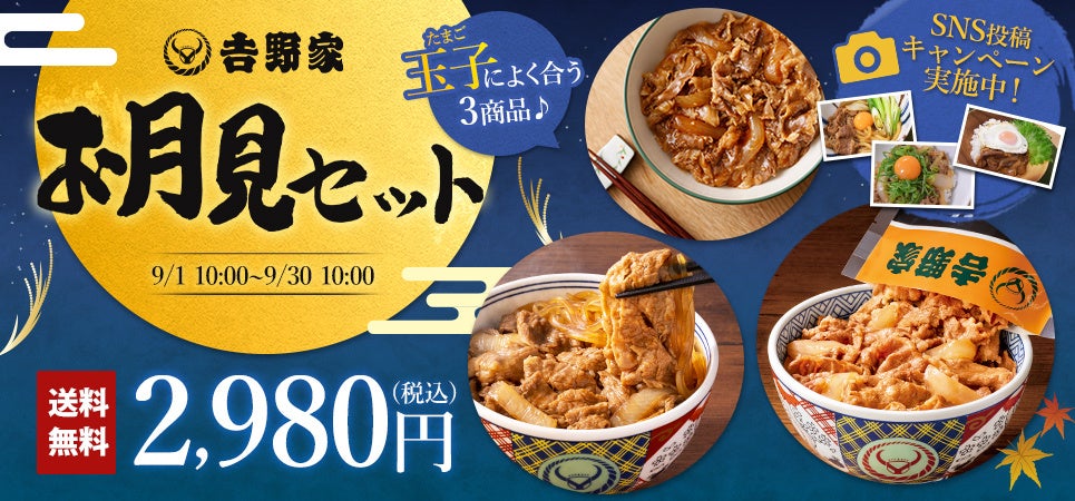 「お月見セット」は玉子を加えてアレンジすると美味しい商品を複数まとめた特別セットです。「冷凍牛丼の具」と「冷凍牛鍋丼の具」、「冷凍牛焼肉の具」各2袋をセットにし、税込価格2,980円(送料無料)で提供します。販売期間は9月1日(木)10時から9月30日(金)10時までの1ヶ月間です。同期間中、吉野家店舗で販売している「月見牛とじ御膳」「月見牛とじ丼」などのお月見商品(牛丼と玉子も可)または吉野家冷凍商品と玉子を合わせた「お月見料理」の写真を「#お月見吉野家」のハッシュタグをつけて投稿すると、抽選で冷凍商品詰合せや吉野家店舗で利用できる吉野家プリカ(1,000円分)が合計23(つきみ)名にプレゼントが当たるInstagram&Twitter連動キャンペーンも実施します。