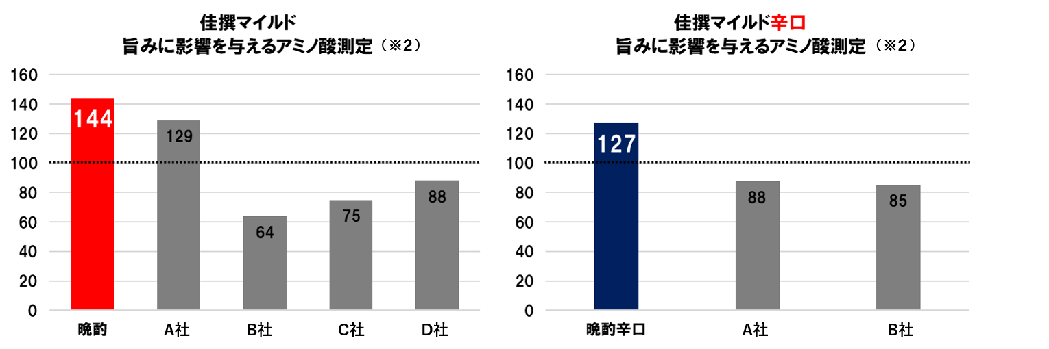 ※2:日本盛調べ(2022年3月)。複数あるアミノ酸のうち、旨みに影響を与えるアミノ酸5種類(アスパラギン酸・セリン・グルタミン酸・グリシン・アラニン)を測定。対象商品の平均値を100とする。