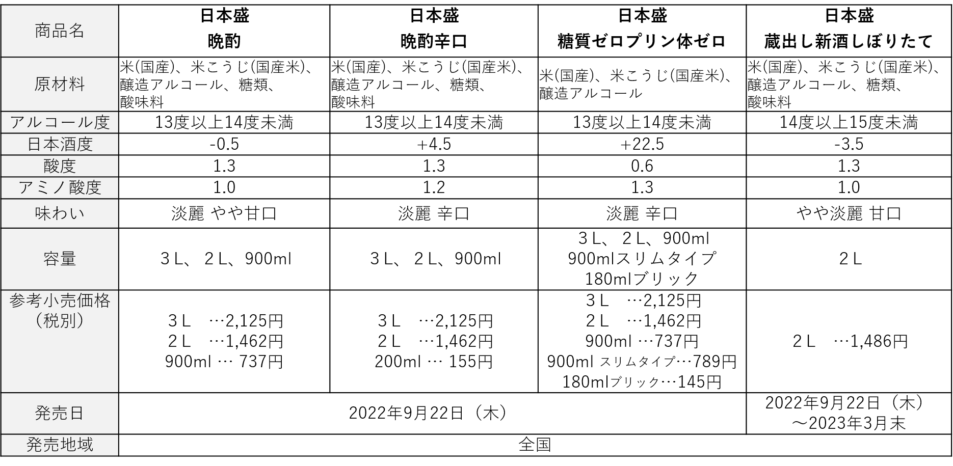 日本盛株式会社(本社:兵庫県西宮市、代表取締役社長:森本 太郎)は、2022年9月22日(木)からコロナ禍で需要が増えた「家飲みニーズ」に合わせ、より店頭でお客様が分かりやすい商品パッケージや酒質への変更を行います。それに伴い、下記の通り商品リニューアル及び期間限定商品を発売致します。