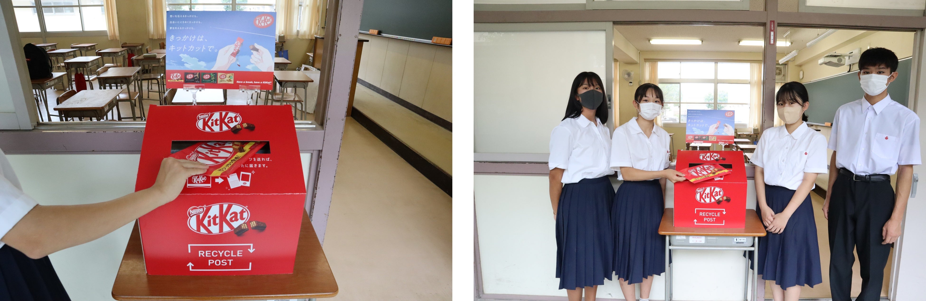 「キットカット」の外袋の紙パッケージは、雑がみとして古紙回収に出せる素材で、紙資源になることから、回収ボックスを設置し、古紙回収を行い、その一部が活用されて紙製のリアル「キットカード」へと生まれ変わります。まず初めに神戸市にある兵庫県立御影高等学校に9月から設置し、今後より多くの方にご協力いただけるよう、回収ボックスの設置場所を順次拡大予定です。