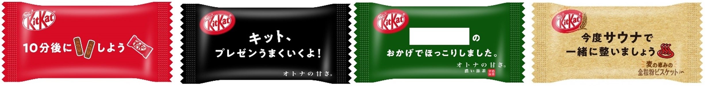 「キットカット ミニ」には、友達や家族と話すきっかけ、「キットカット ミニ オトナの甘さ」には、仕事でのきっかけ、「キットカット ミニ オトナの甘さ 濃い抹茶」には気持ちを安らかにするきっかけ、「キットカット ミニ 全粒粉ビスケット in」には自分を整えるきっかけのメッセージがデザインされています。