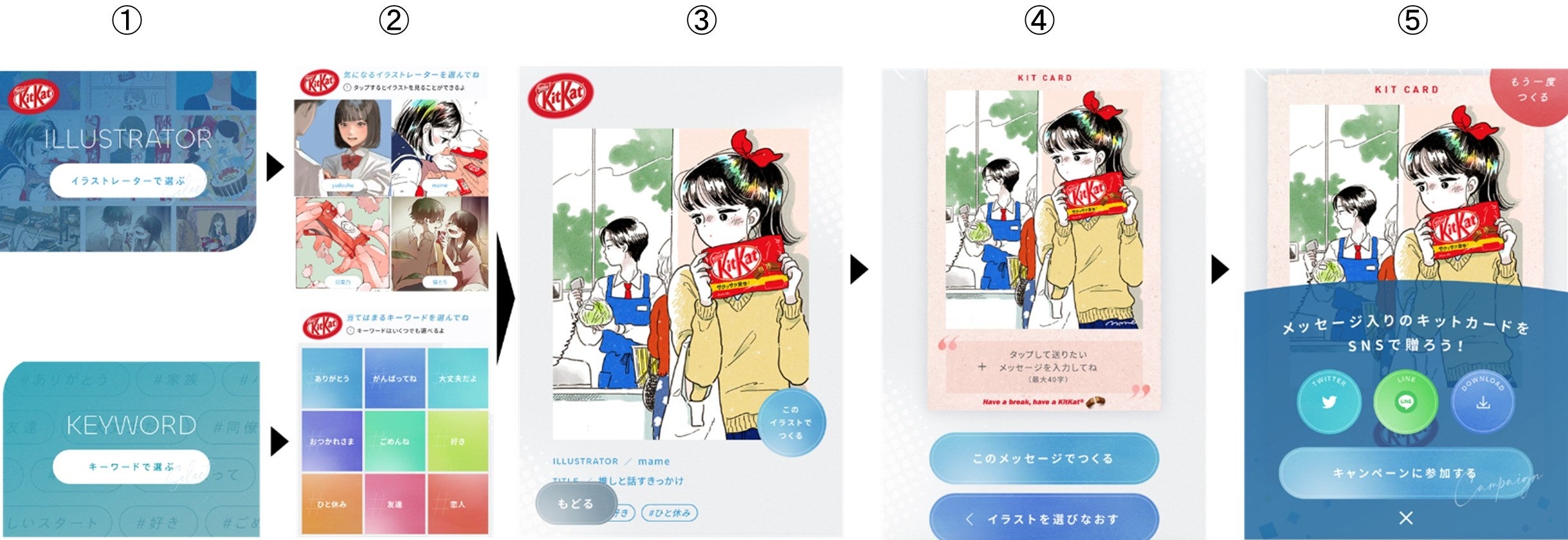 事前にSNS上で「キットカット」が前向きな一歩のきっかけとなった実話を学生部門、家族部門、仕事部門、未来部門の4つの部門で募集した結果、総数2,139の応募がありました。その中から50名の方の実話をもとにした“きっかけストーリー”を、山田尚子監督とmameや日菜乃など人気イラストレーター25名が描きおこしたデジタルカードが「キットカード」です。「キットカード」を“きっかけ”に、大切な人へ想いを届けることができます。