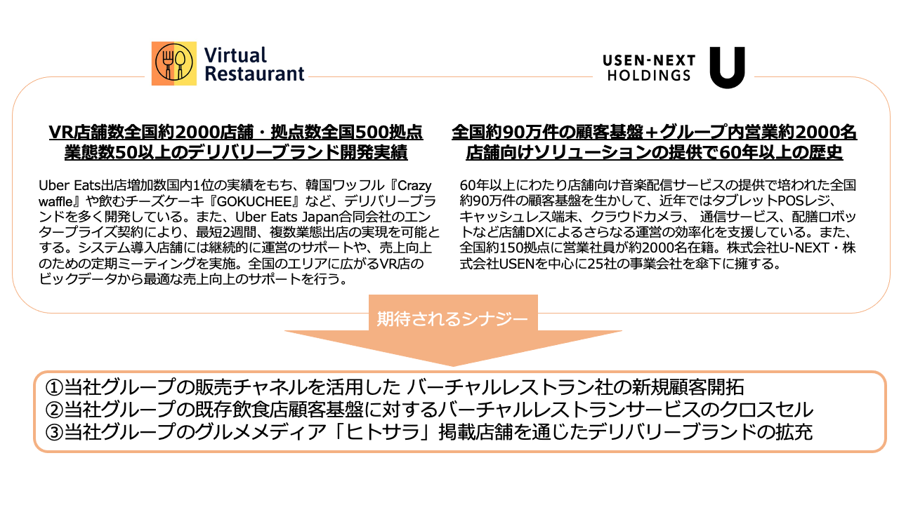 当社はUSEN-NEXT GROUPの販売チャネル(フィールドセールスやインサイドセールスなど)を活用し、バーチャルレストランシステム導入店舗のさらなる拡大と、新規顧客開拓や既存飲食店へのクロスセルを見込んでいます。またUSEN-NEXT GROUPの株式会社USEN Mediaが運営するグルメメディア「ヒトサラ」の掲載店舗を通じ、デリバリーブランドの拡充を可能とし、拡大に伴う業態不足への課題解決を見通しております。