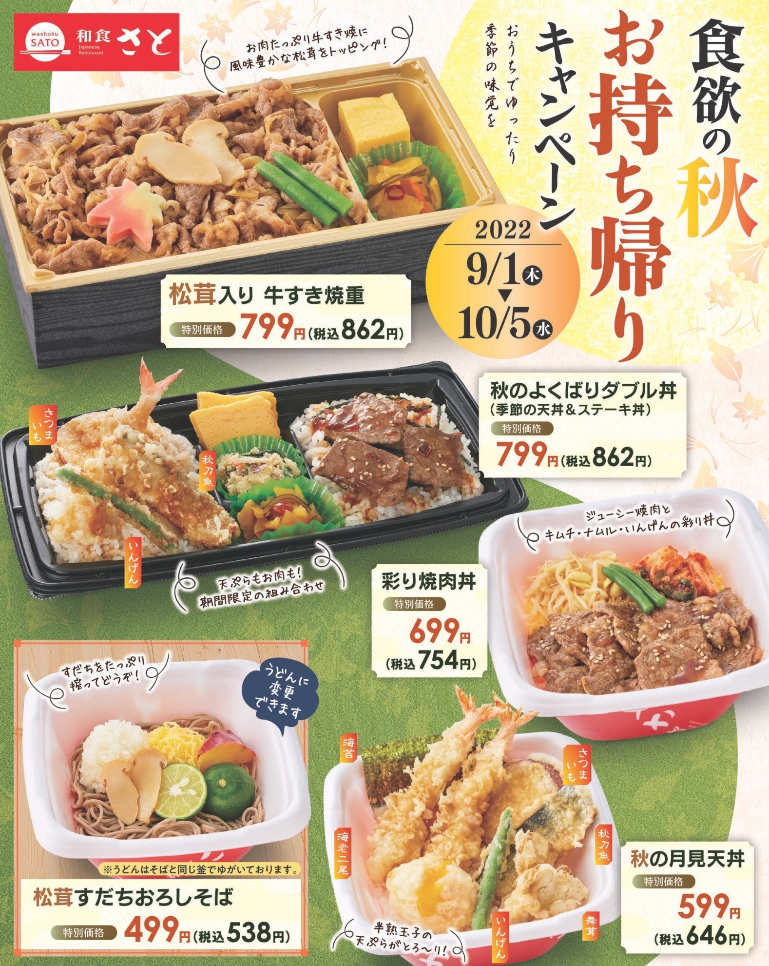 和食さとでは、9月1日(木)より秋のお持ち帰りキャンペーンとして、秋の味覚「松茸」や「秋刀魚」「さつまいも」など旬の食材を使用した豪華な弁当をご用意しました。