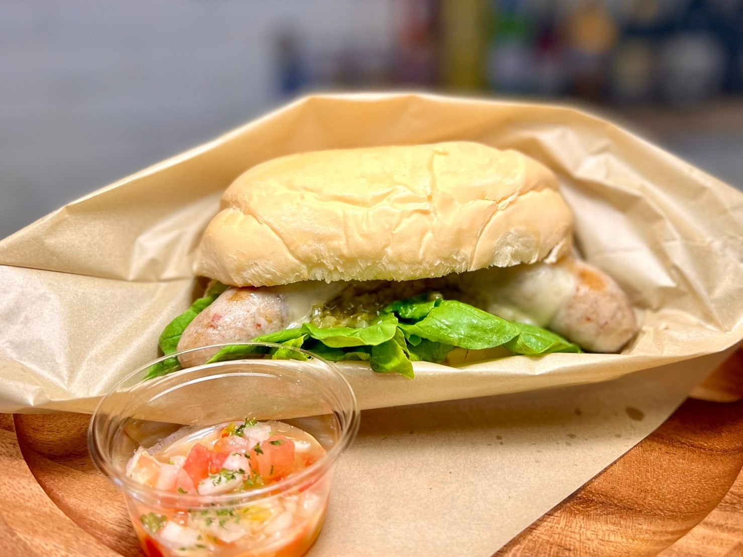 ブラジルの生ソーセージ(リングイッサ)のサンドイッチは焼き上げる際に肉汁が流れ出さないよう特殊な方法で加熱してあるので、旨味を逃しません。リングイッサからあふれる肉汁に気をつけてお召し上がりください。