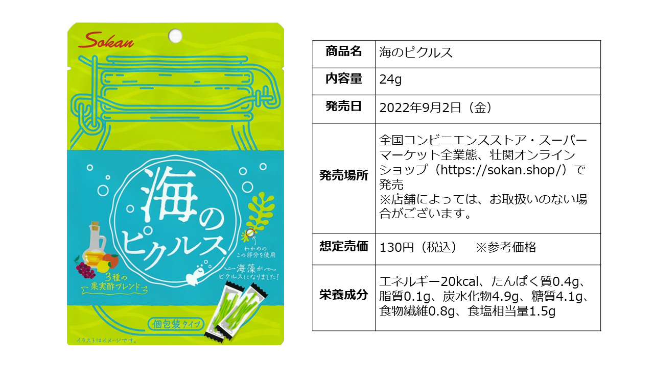 株式会社壮関(本社:栃木県矢板市 代表取締役社長:板山 健一)は、新商品『海のピクルス』を2022年9月2日(金)より全国コンビニエンスストア・スーパーマーケット全業態および壮関オンラインショップ(https://sokan.shop/)で発売いたします。