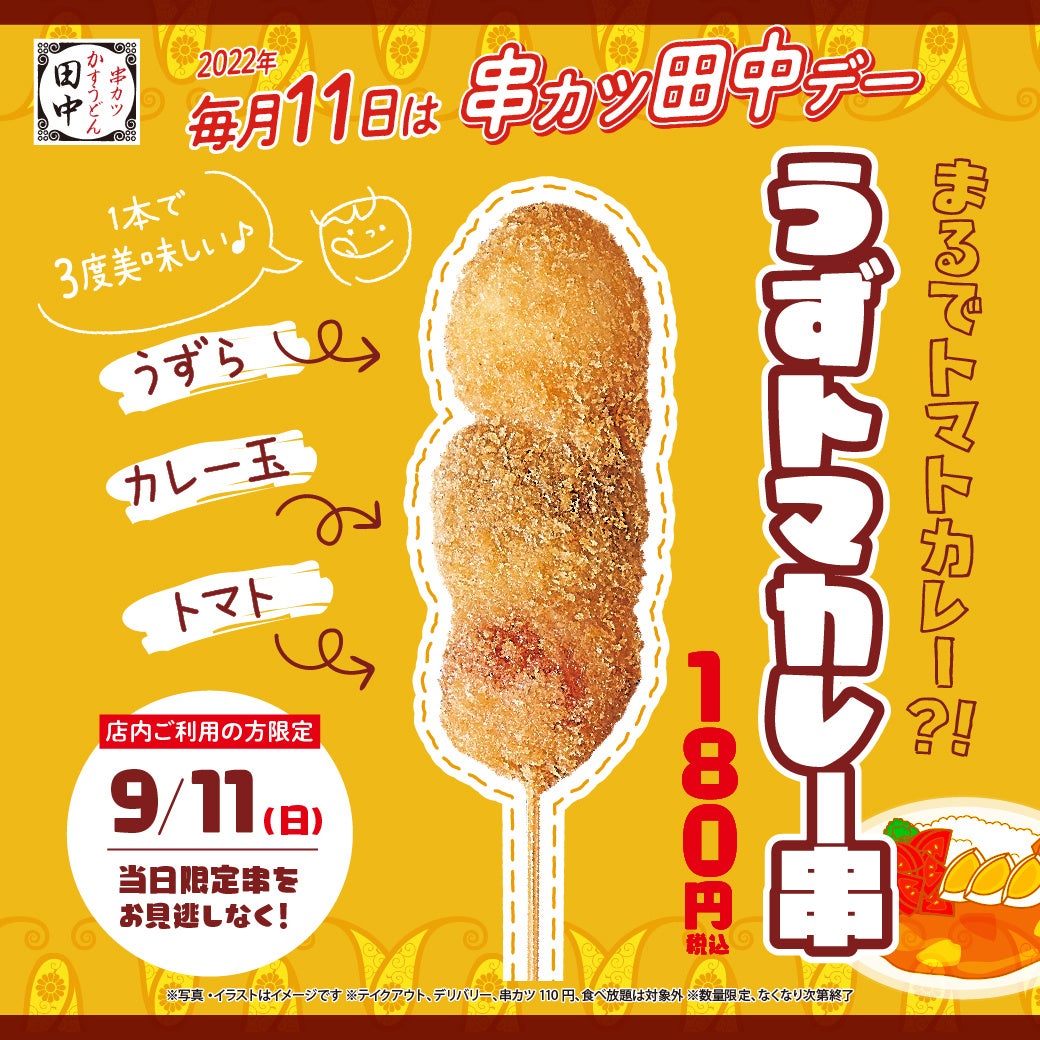 株式会社串カツ田中ホールディングス(本社:東京都品川区東五反田、代表取締役社長:坂本 壽男)は、お客様に店内でのお食事を楽しんでいただくため、2022年1月より「串」の形に見立てた毎月11日を「串カツ田中デー」として、その日限りの特別な串カツを販売しております。