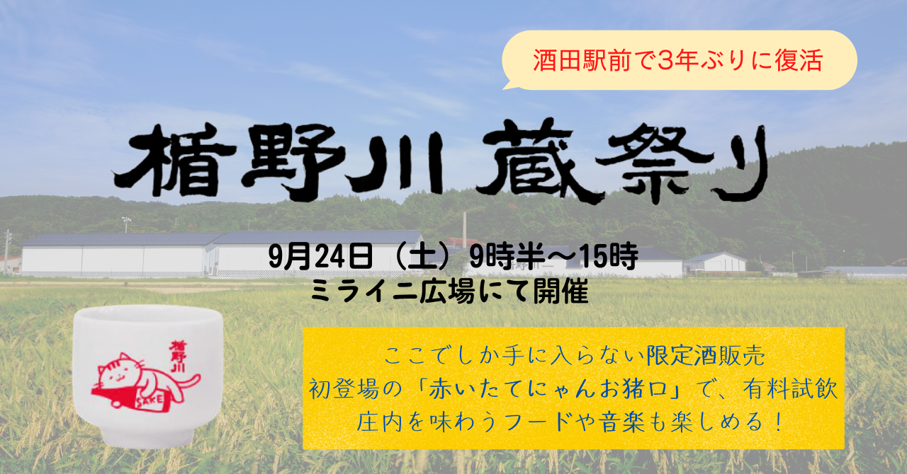 楯の川酒造株式会社(本社:山形県酒田市、代表取締役:佐藤淳平、以下「楯の川酒造」)は、9月24日(土)に「楯野川 蔵祭り」を酒田駅前のミライニ広場にて開催いたします。蔵祭りのためだけに醸造した限定酒の他、限定お猪口で有料試飲・庄内を味わえるフードの数々とともにステージ企画も展開し〈食・酒・音楽を多角的に楽しめるイベント〉としてお楽しみいただけます。