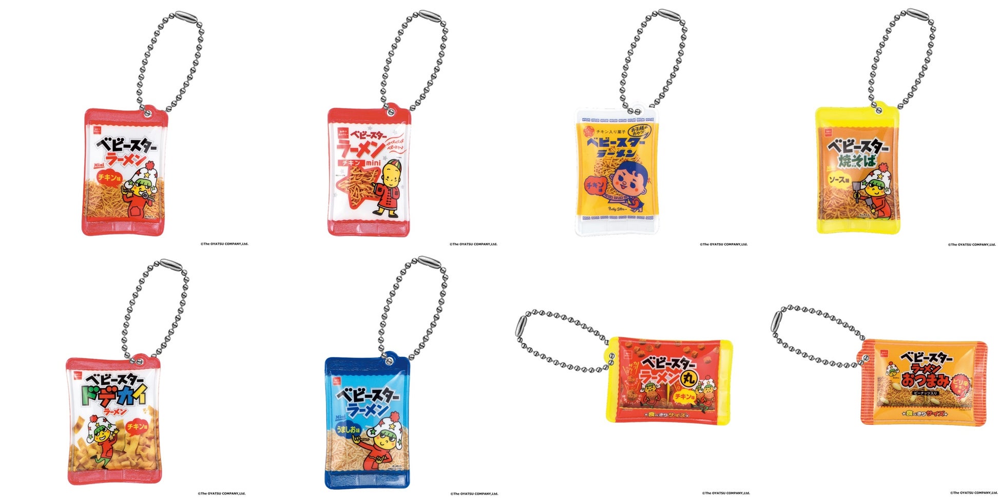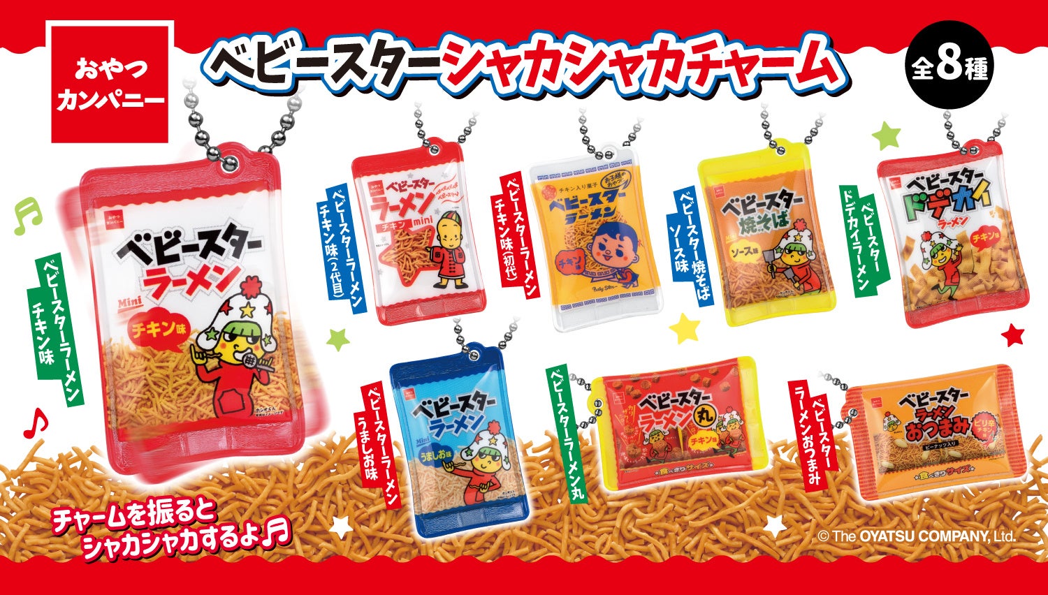 ボールチェーン付きのチャームにした『ベビースターシャカシャカチャーム』は全8種類。おなじみの3代目キャラクター「ホシオくん」が目を引くベビースターラーメンチキン味!そして大人世代には懐かしい、初代・2代目キャラクターのレトロパッケージもラインナップ。さらに、チキン味に次ぐ人気味のベビースター焼そばと、ベビースターラーメンうましお味に加えて、ベビースターの兄弟ブランドたちも勢ぞろい。