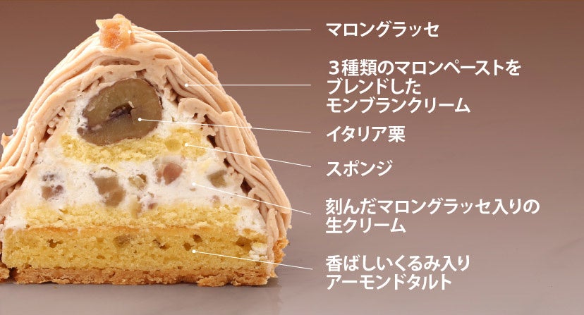 栗の甘みが凝縮したマロングラッセ入りの生クリームに香り高いイタリア栗を丸ごと重ね、3 種類のマロンペーストをブレンドした風味豊かな極細モンブランクリームをたっぷりと絞りました。