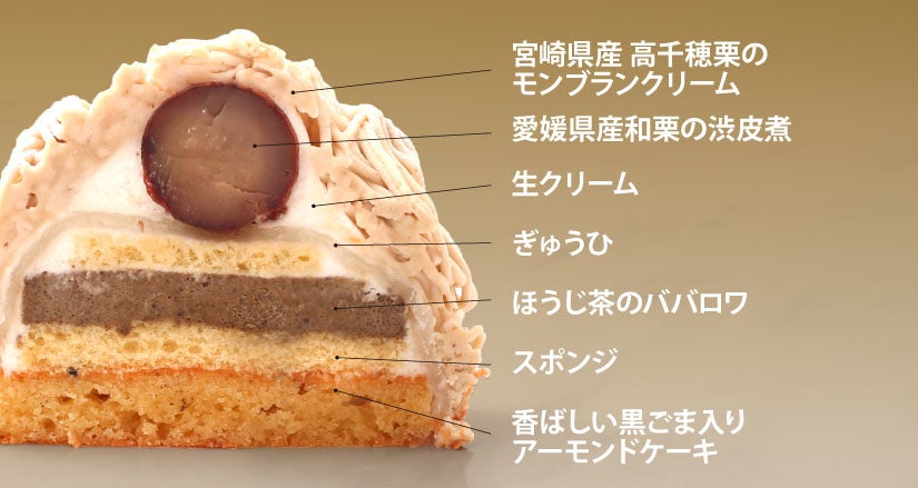 宮崎県産「高千穂栗」の香り豊かなモンブランクリームで、ほっくり甘い愛媛県産和栗を包みました。2 つの和栗に芳ばしい香りのほうじ茶のババロワ、しっとり焼き上げた黒ゴマ入りアーモンドケーキ、ぎゅうひを合わせて。和素材の組み合わせが奏でる豊かな美味しさをお届けいたします。