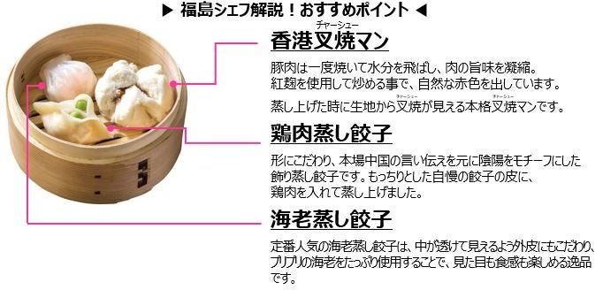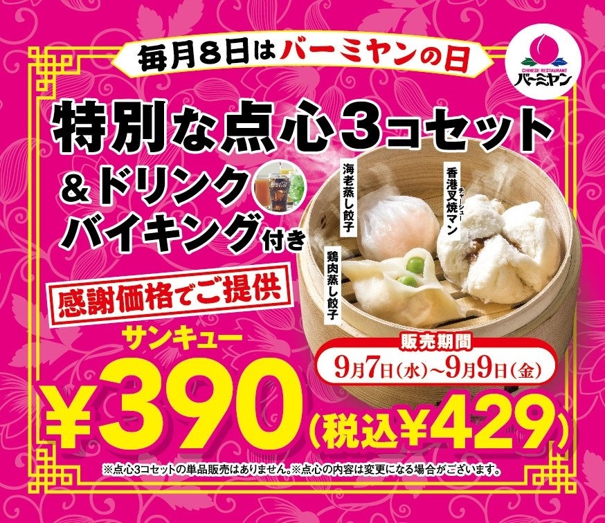 | 【毎月8日は“バーミヤンの日” おすすめポイント】 ① 点心3点とドリンクバイキングの「飲茶セット」を“3日間限定”で販売 こだわりの「香港叉焼(チャーシュー)マン」、「鶏肉蒸し餃子」、「海老蒸し餃子」がセットになって新登場。毎月“バーミヤンの日”前後の数日間のみ、スペシャルな点心をお楽しみいただけます。 ② セットで“ありがとう価格”の390(サンキュー)円(税込429円)!特別メニューを特別価格で ~10月以降もバーミヤンの日(8日)前後・数日間限定で同様の企画を開催予定(※)です~ |