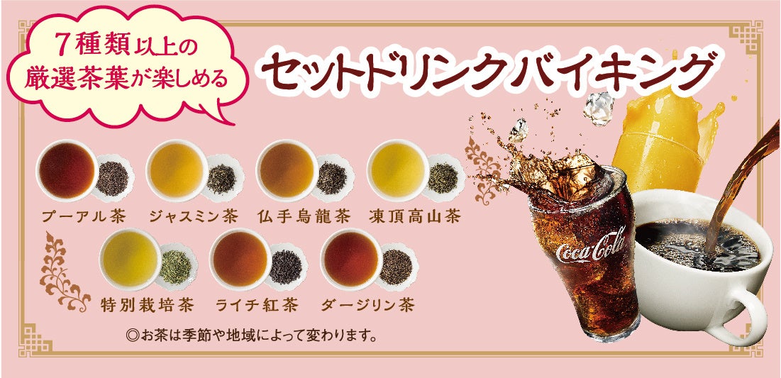 バーミヤンのドリンクバイキングでは、20種類以上が飲み放題!飲茶のお供である中国茶の種類も充実しており、定番のプーアル茶をはじめとした、7種類以上の厳選茶葉をお楽しみいただけます。