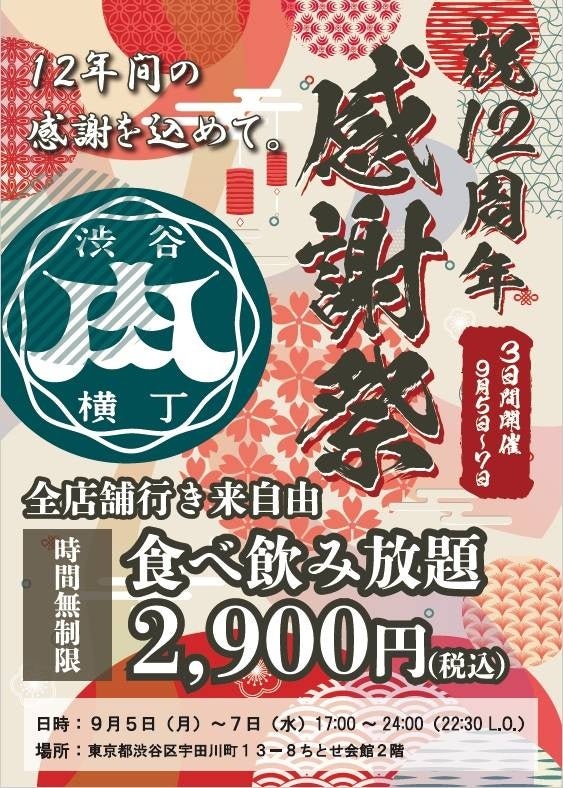 THE WHY HOW DO COMPANY株式会社(本社:東京都新宿区,代表取締役社長:篠原 洋,以下「ワイハウ社」という)の100%子会社の株式会社渋谷肉横丁のフードプレイス渋谷ちとせ会館「渋谷肉横丁」が2022年9月1日,12周年を迎えました。これを記念して,2022年9月5日から7日まで渋谷肉横丁において「祝12周年感謝祭」を開催いたします。
