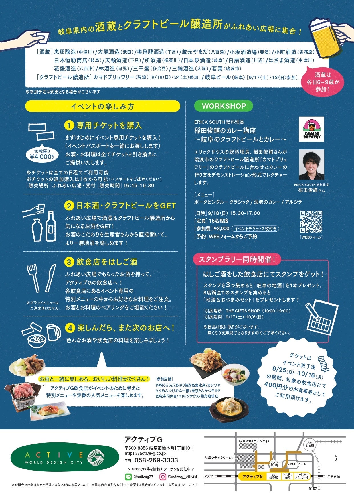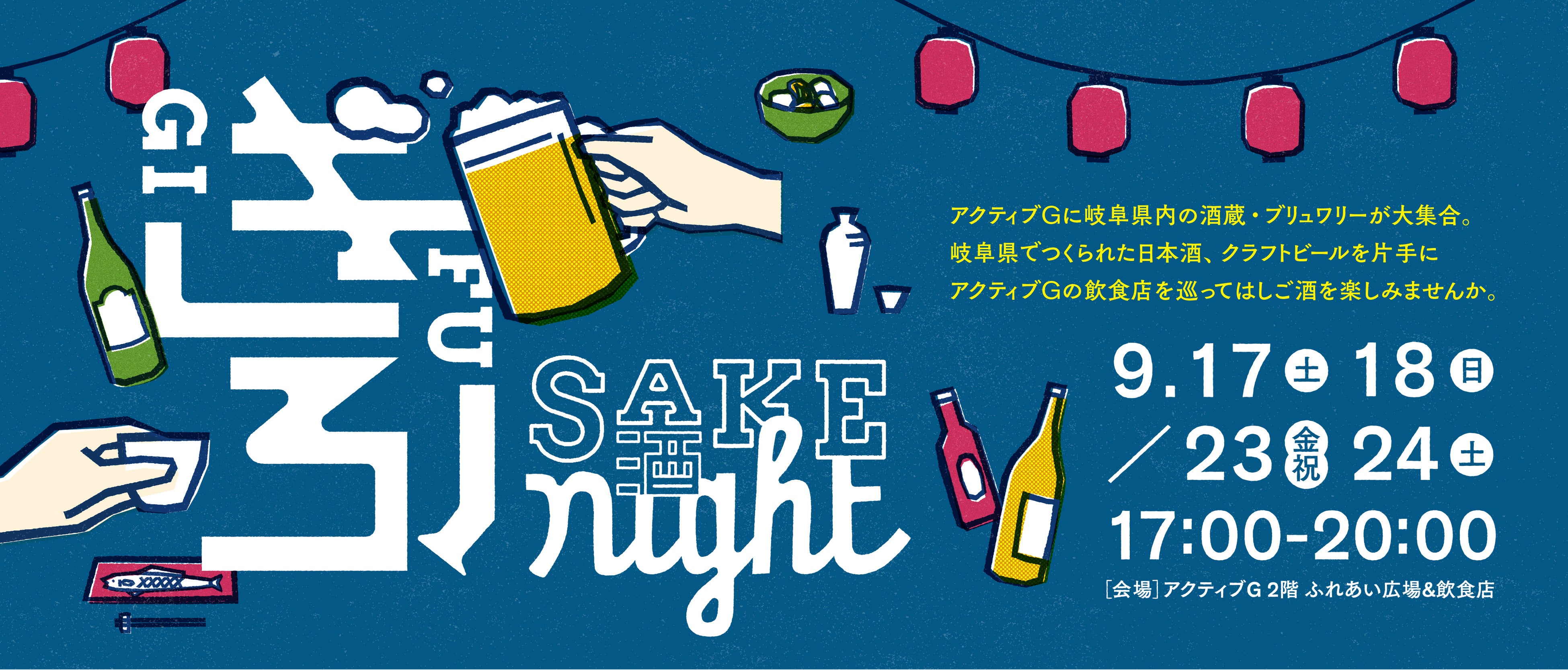 アクティブGでは、9月17日(土)・18日(日) / 9月23日(金祝)・24日(土)の4日間、岐阜県の地酒・クラフトビールと飲食店の料理を堪能できるイベント『ぎふSAKE night』を初開催いたします。
