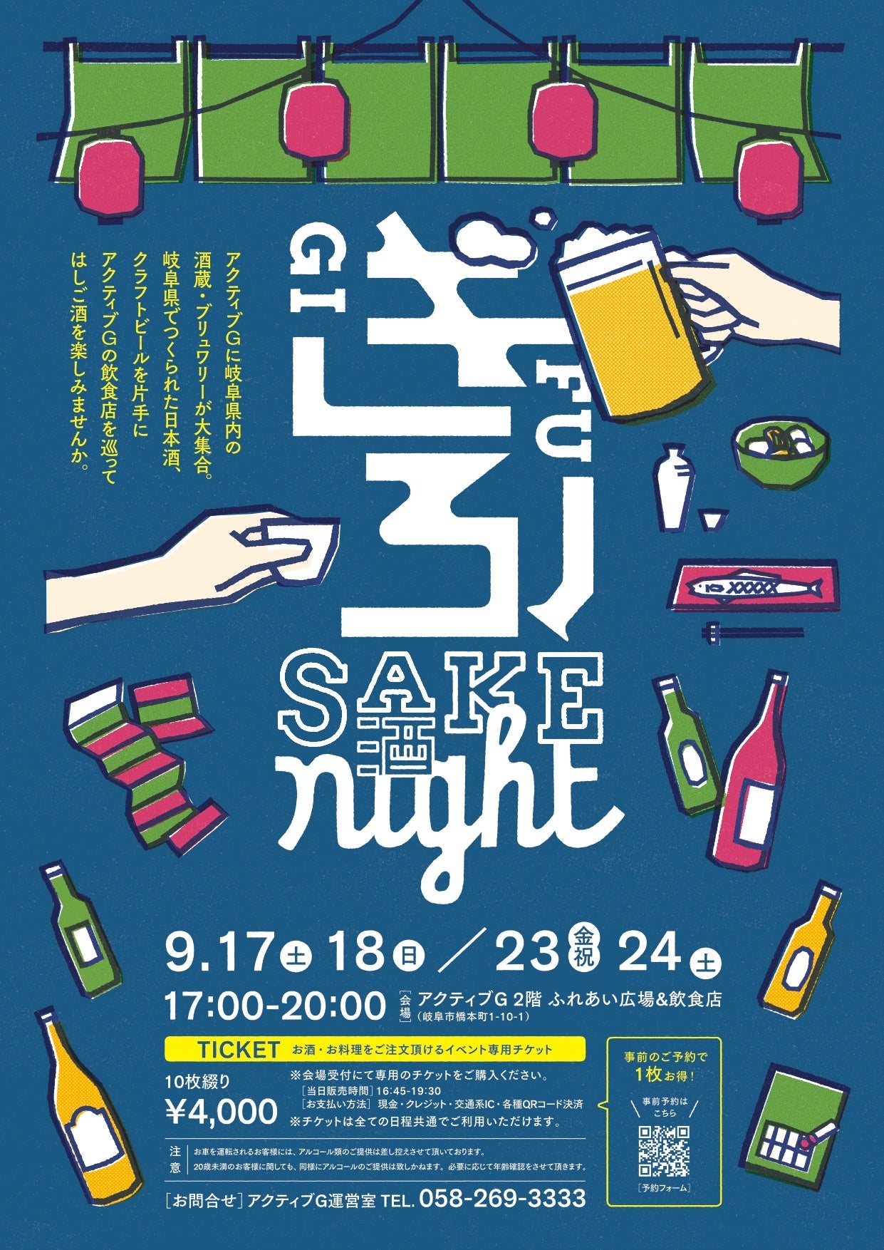 アクティブG (岐阜県岐阜市) では、2022年9月17日(土)・18日(日) / 9月23日(金祝)・24日(土)の4日間、岐阜県の地酒・クラフトビールと飲食店の料理を堪能できるイベント『ぎふSAKE night』を初開催いたします。