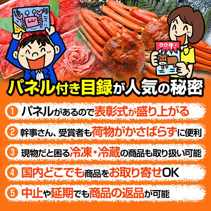 ゴルフコンペの優勝商品や景品に大人気の「パネル付き景品目録」の新商品。パネル付きの目録はコンペや二次会、イベント、宴会の景品に超おすすめ。幹事さんも貰った方もかさばらず、好きな時に注文、お取り寄せできるのも好評です。