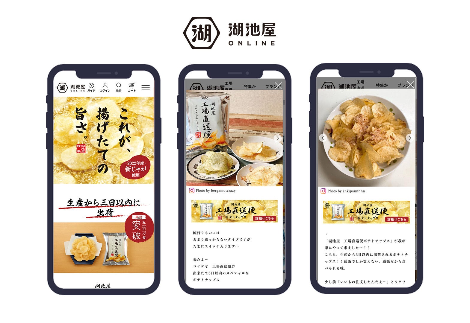 弊社は日経BPコンサルティング ブランドジャパン(2022)にて、1500ブランド中14位という評価を頂きまして、特に「親しみ」「好感度」「共感」という項目において高い評価を頂いております。また弊社通販では、オリジナル商品として「湖池屋工場直送便」を販売しておりまして、多くのお客様よりご好評頂いており、SNSでも話題になっておりました。こうした弊社ならではのSNSの特性もあり、湖池屋ファンの方に「湖池屋通販」「湖池屋工場直送便」のUGCを活用したいと考え、採用に至りました。