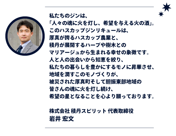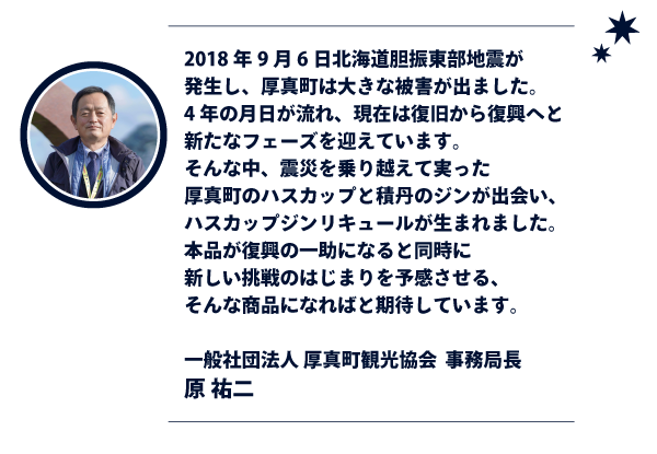 想いある事業者が、北海道にはたくさんいます。みんなで力を合わせることで生まれる未来を見据えながら、今回のハスカップジンリキュールの売上の一部を厚真町ハスカップのために寄付する「ハスカップ★ファンディング」を実施し、消費が未来への投資となるように尽力致します。