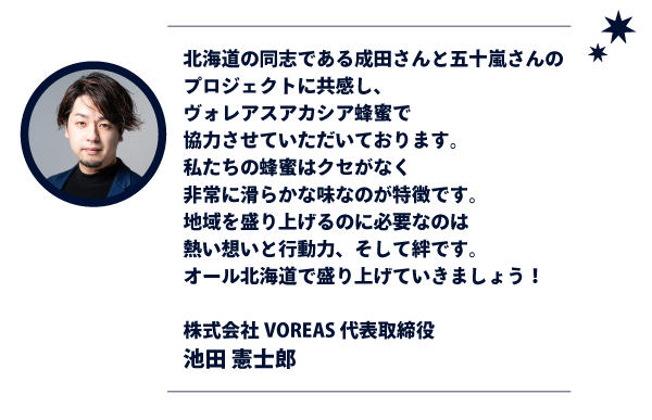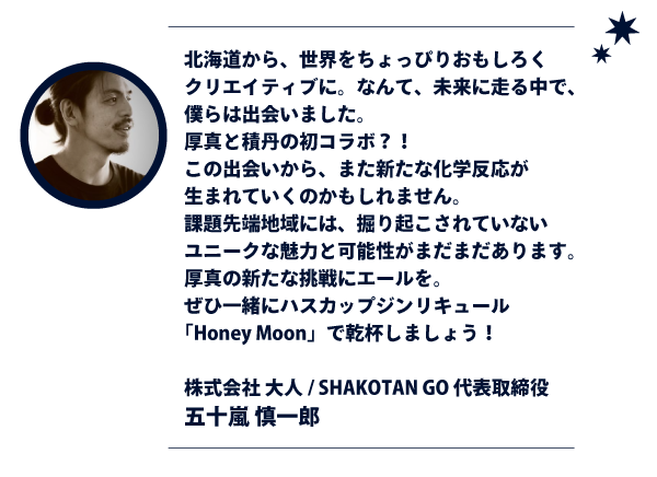 現地を視察し、「せっかくだから厚真✖️積丹で取り組みができないか」と厚真町が誇る山口農園のハスカップと積丹町のクラフトジンのコラボが実現。コンセプトを「Honey Moon」としたことで、砂糖を使用せず、生はちみつを販売されている旭川のプロバレーボールチームVOREASの池田社長に声かけし、オール北海道での取り組みを企画しました。