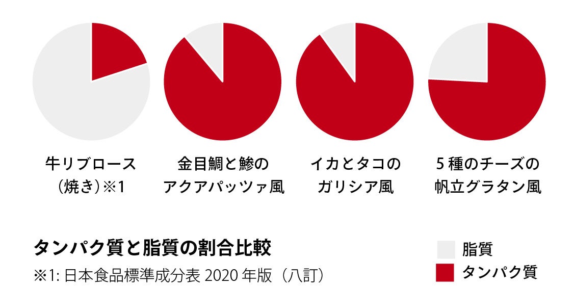 「5種のチーズの帆立グラタン風」「イカとタコのガリシア風」「金目鯛と鯵のアクアパッツァ風」