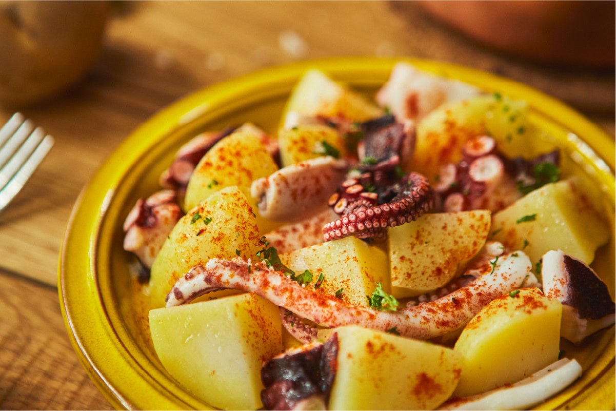 スペイン、ガリシア地方の伝統料理”イカとタコのガリシア”をイメージしておつくりしました。