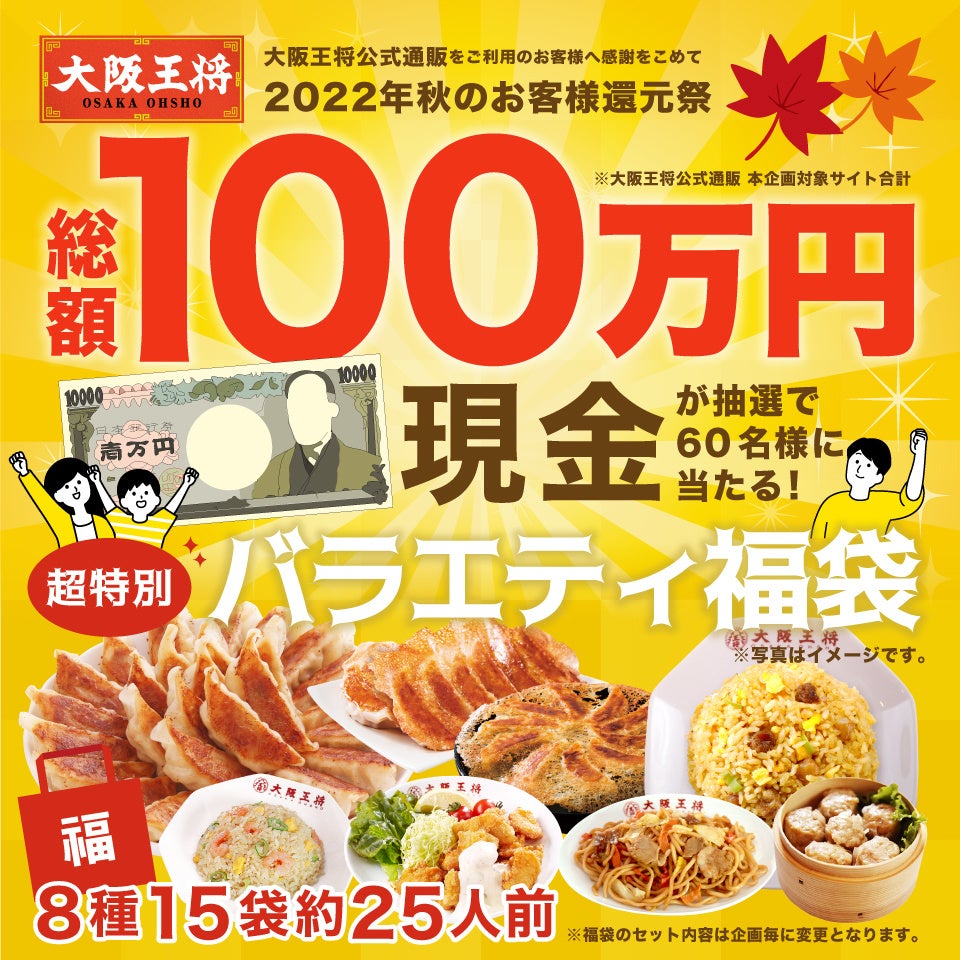 さらに、「超特別バラエティ福袋」を購入すると抽選で60名様に総額100万円の現金が当たる「2022年秋のお客様還元祭」を、販売開始日と同日より開催いたします。食欲の秋にぴったりのボリューム満点の中華料理を、 “プラスアンド”の楽しみとともにお届けいたします。