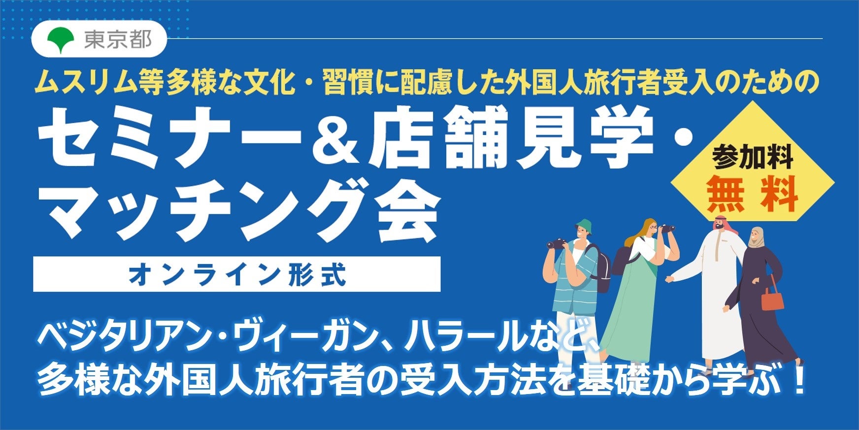 東京都では、インバウンド需要回復に備え、ムスリムやベジタリアンをはじめ、様々な文化・習慣・制限を持つ外国人旅行者が、安心して東京観光を楽しめる環境づくりを促進するためのセミナー、店舗見学・マッチング会を開催します。