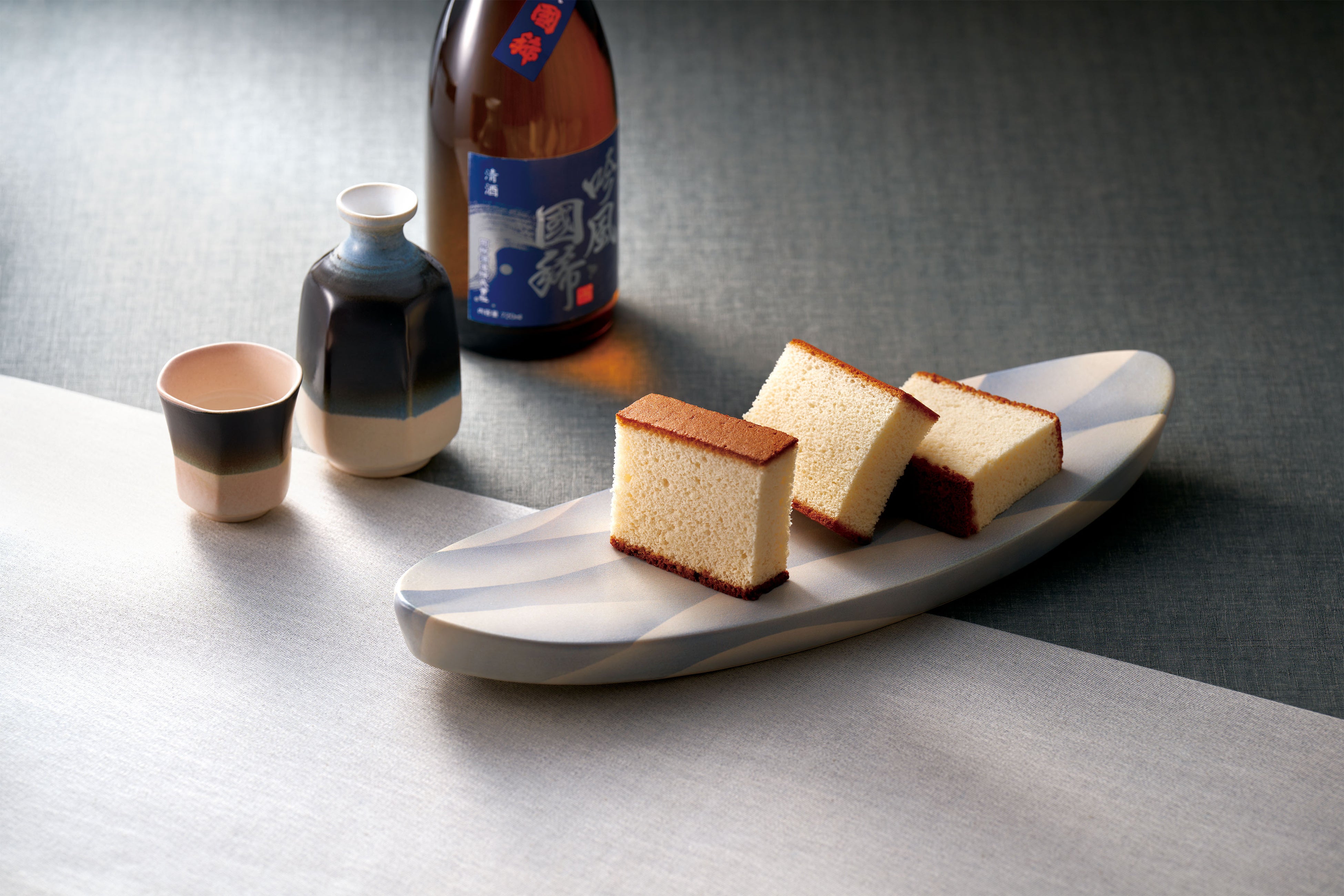 日本酒の香りがふわっと香り、白い生地が目を引く『吟風國稀かすていら』は、吟風國稀、酒粕、酒米を使用しており、芳醇な風味を味わうことができます。また、日本酒とも一緒にお楽しみいただける仕上がりです。