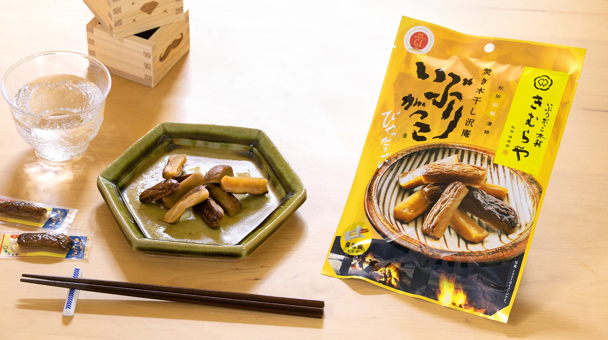 秋田伝統の味として広く全国的に親しまれている「いぶりがっこ」は、元々、冬場の食糧難を解決するための保存食として考えられ、冬の寒さ、雪の多さにも負けず、家族においしいものを食べさせたいとする家庭の知恵から生まれたと言われています。当社もお子様からご年配の方まで多くのお客様においしさを伝えることを信条としている中、伝統とおいしさを半世紀以上にわたり守られている「いぶりがっこ本舗 雄勝野きむらや」の思いを知り、お漬物をお菓子としても食べられるよう遊び心を加え、本商品を生みだしました。広く知られるいぶりがっこの起源「いぶりがっこ本舗 雄勝野きむらや」だからこそできる伝統の味を気軽にどこででも味わっていただきたいと考えて、個包装に仕上げております。