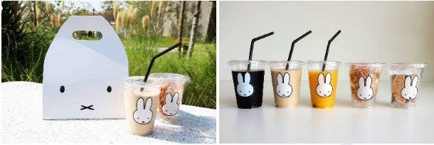 持ち運びも楽しいミッフィーキャリーバッグに、お菓子とドリンクを入れて提供します。お菓子はビスコッティとキャラメルポップコーンから、ドリンクはアイスコーヒー、アイスカフェオレ、オレンジジュースからチョイスできます。