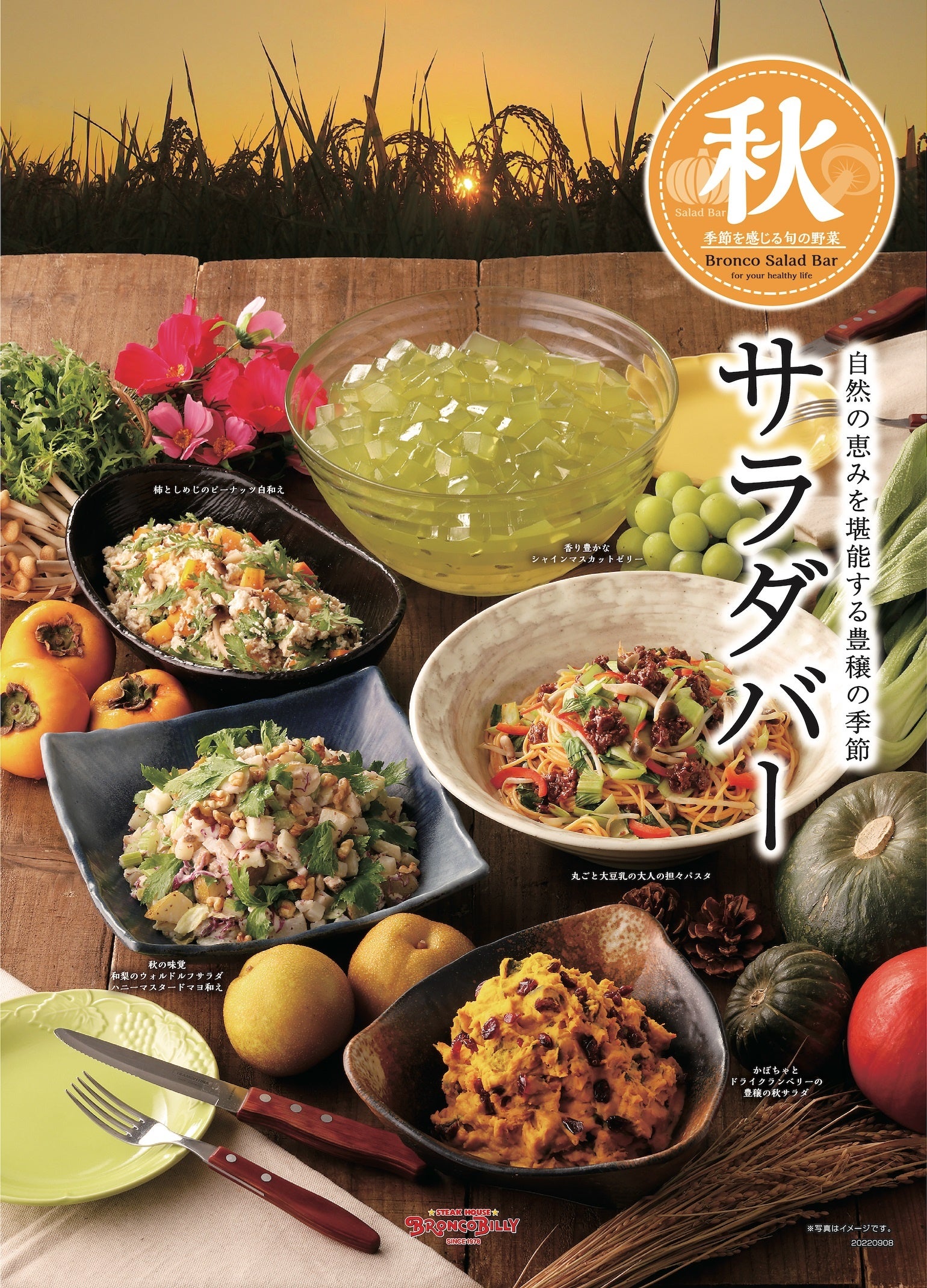 ブロンコビリーのサラダバーは、季節に合わせた旬の食材を使い、年6回惣菜メニューの改訂をしています。残暑を感じながらも秋の気配を感じる9月8日(木)より、季節限定『秋サラダバー』の提供を開始します。