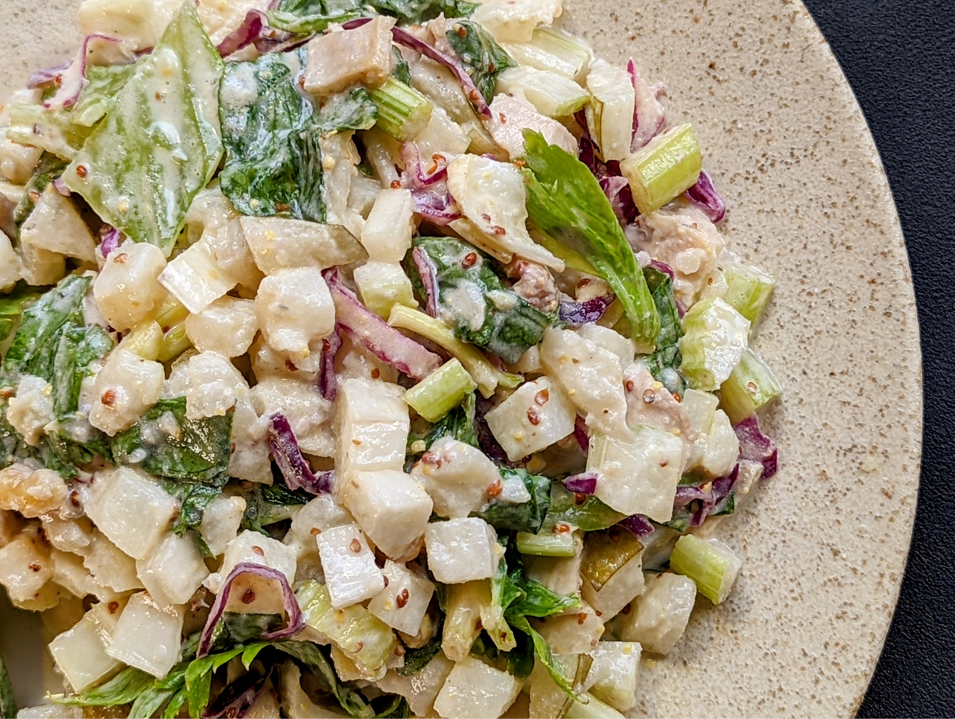 秋が旬の和梨のみずみずしい甘さ、セロリのシャキシャキとして特徴的な風味、カリっと香ばしいクルミ、他にもじゃがいもや蒸しチキンなど、多種多彩な食材をハニーマスタードマヨソースで和え、まとめました。