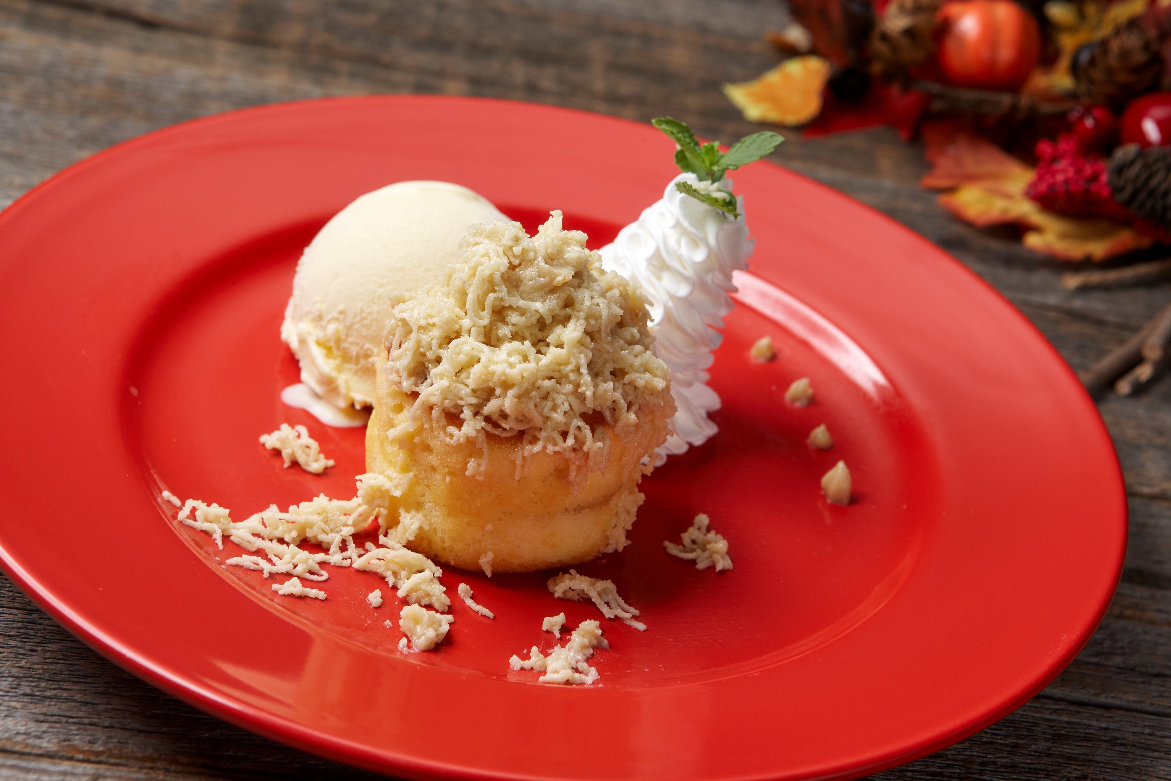 しっとり食感のマフィンの上にたっぷりのマロンバタークリームをふんわりと盛り付けます。