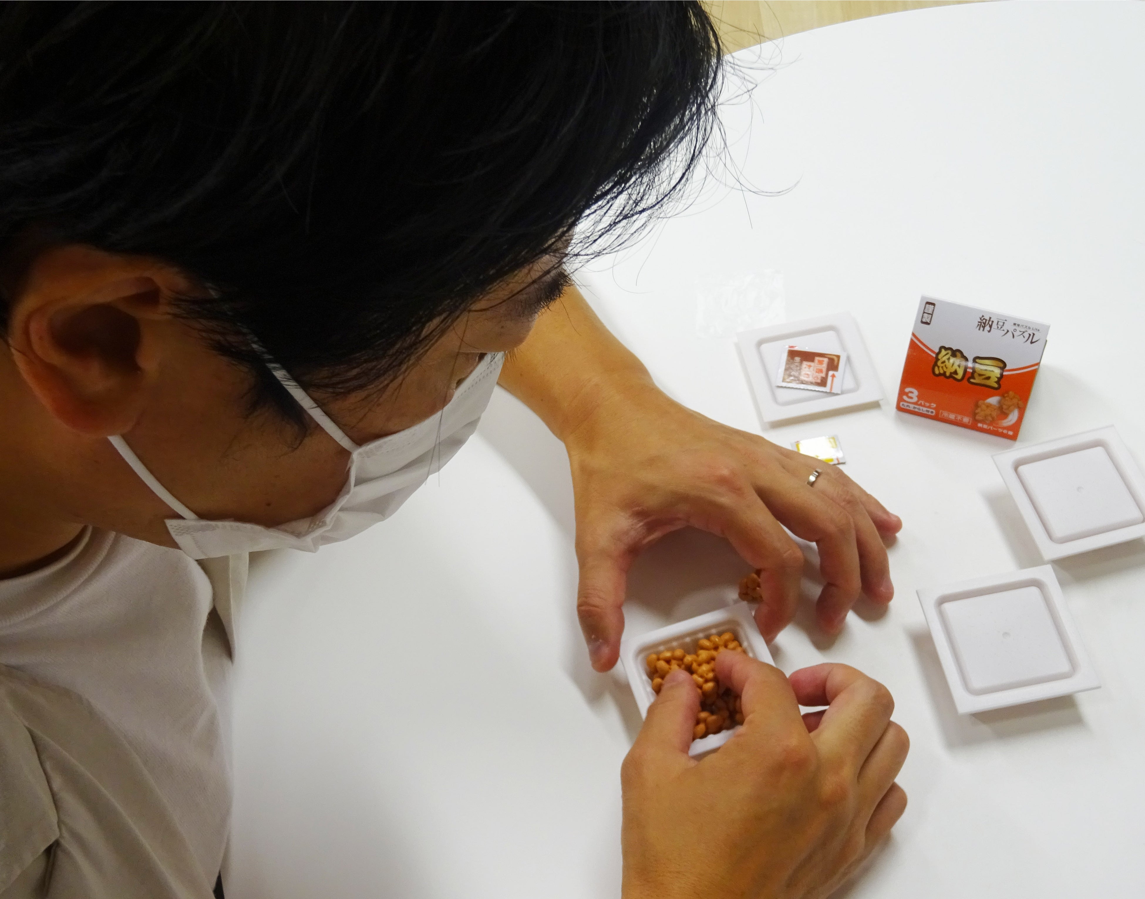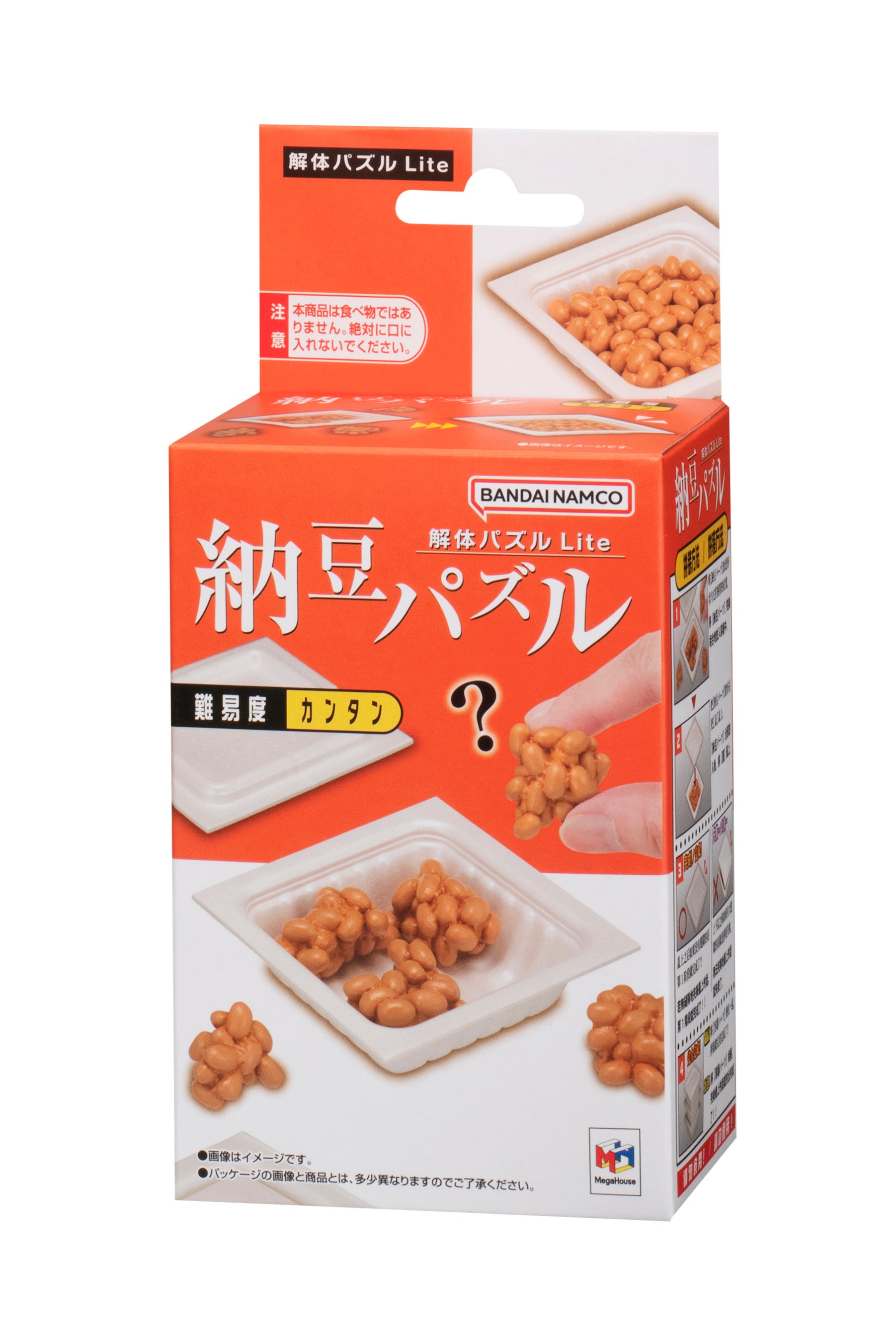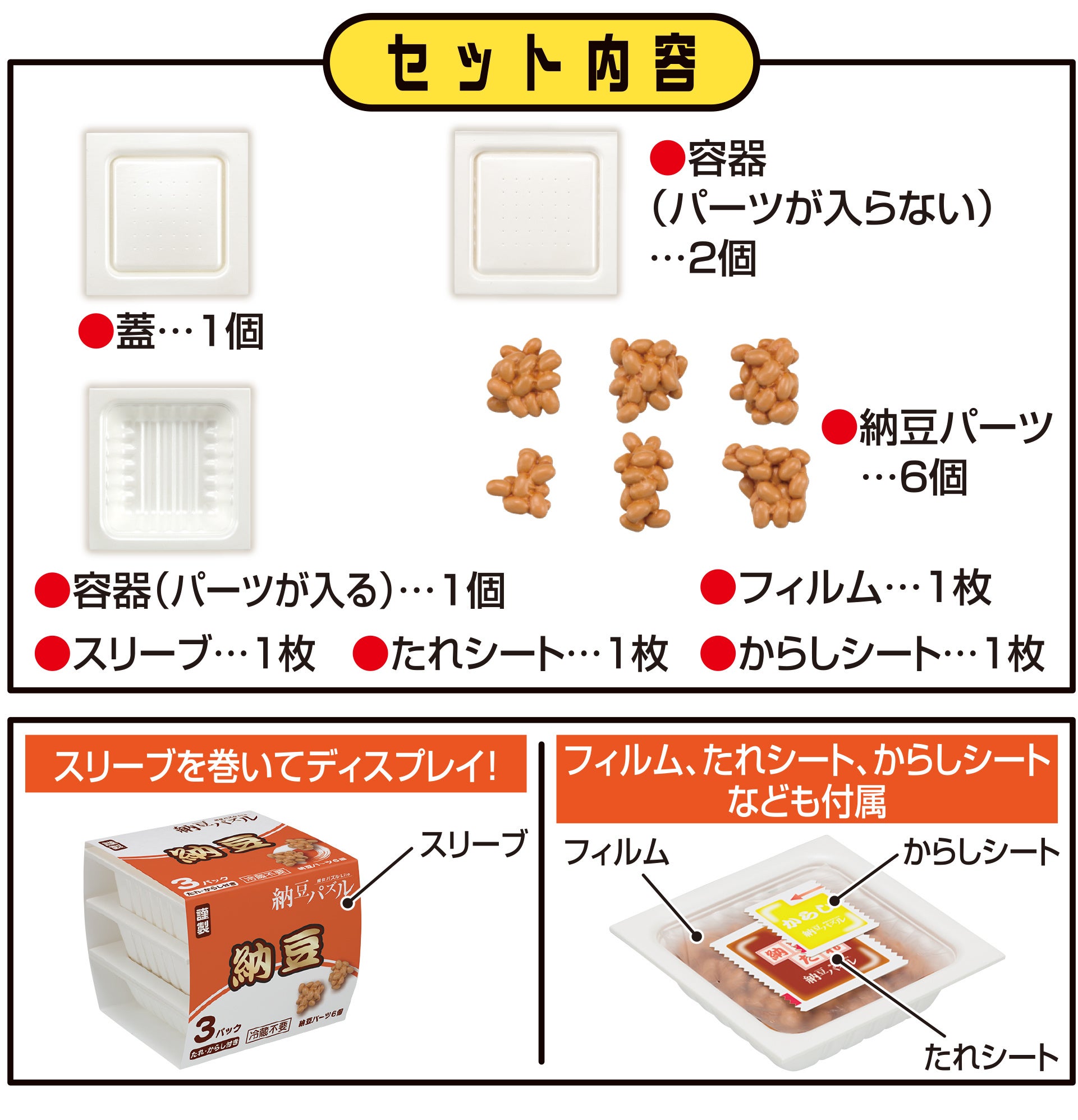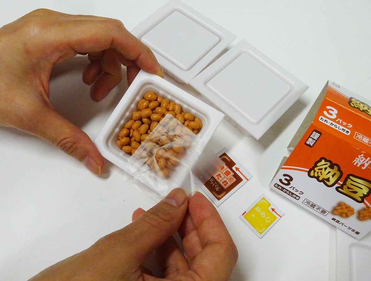同商品は、容器に入っている納豆を完成させるパズルで、①6つの納豆パーツをうまく組み合わせて容器に入れる②フィルムとからしシートとたれシートを入れて蓋をする③容器を3つ重ねる④スリーブを巻く、この4つの工程で遊ぶことができます。納豆パーツは、正しい位置に入れないとふたが閉まらず、 容器も正しい順番で組み合わせないと重なりません。本物そっくりの造形と絶妙な難しさが特長の立体パズルをお楽しみください。