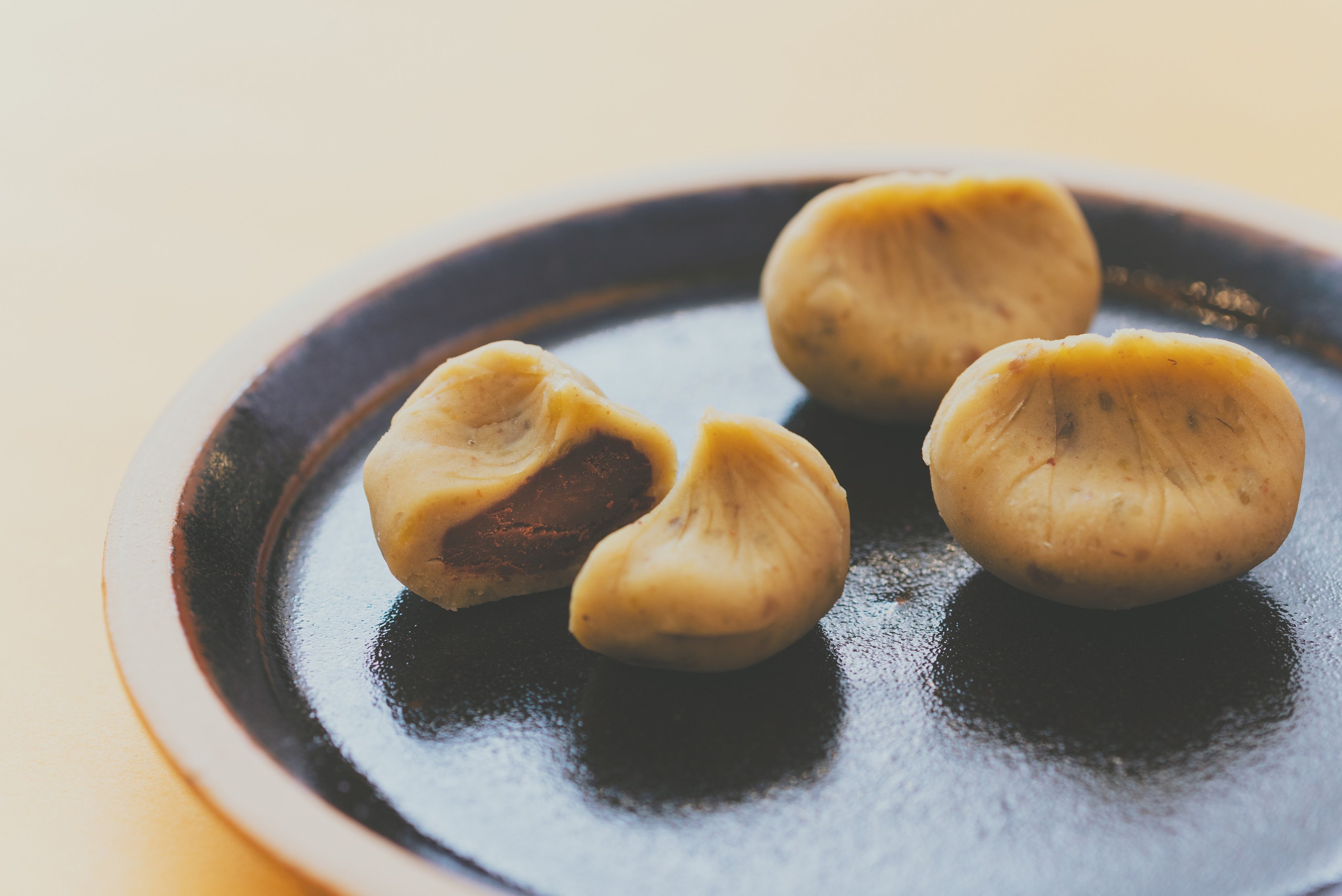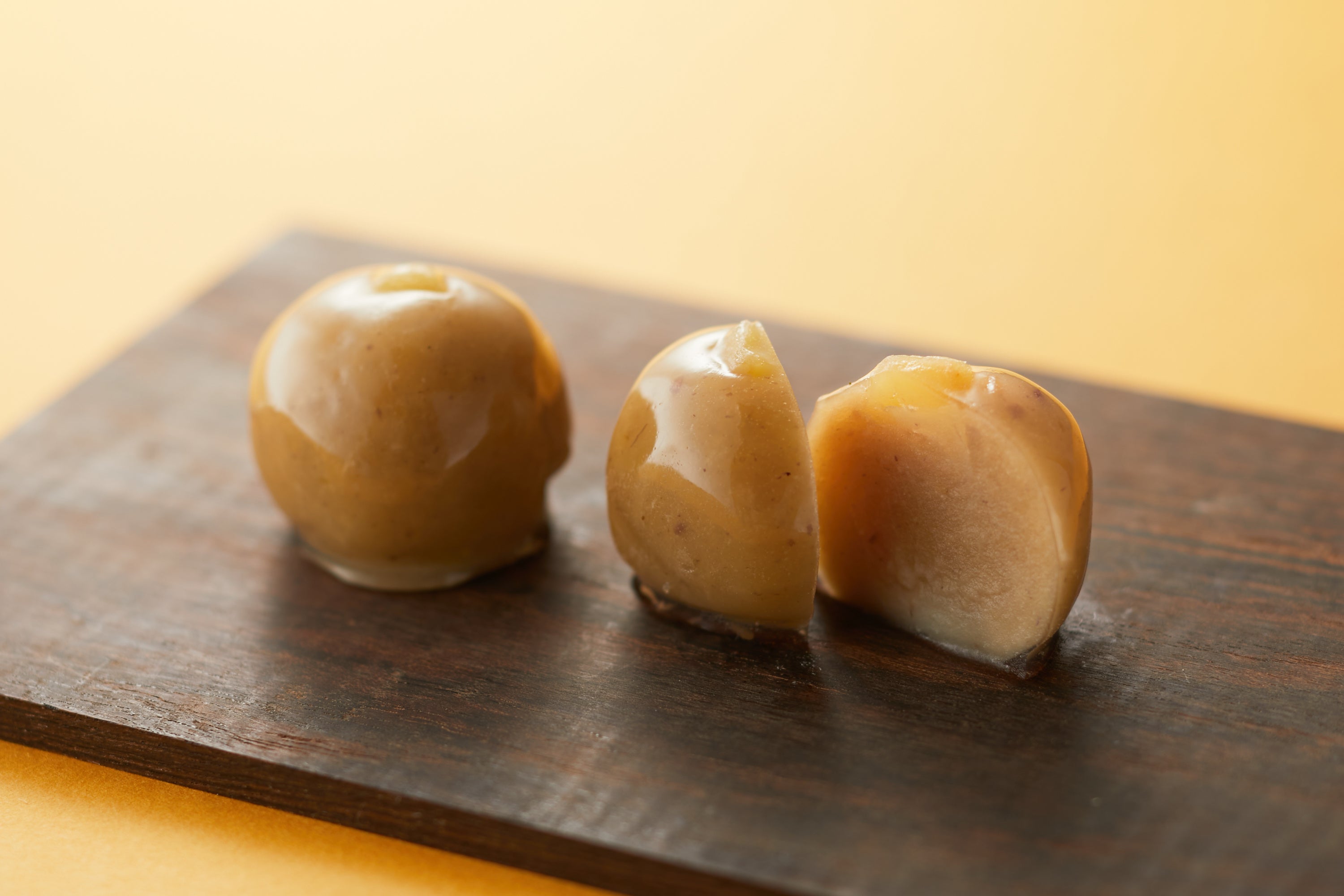 和栗と砂糖だけで作った栗きんとんの芯にスパイスの香りと酸味が特徴のビールとカカオの餡を忍ばせました。合わせて食べると豊かな香りが複雑に絡み合い、新しいおいしさをお楽しみいただけます。